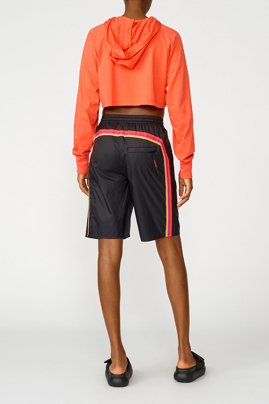 Siga el arco iris, elija los pantalones cortos negros con detalles laterales del arco iris. Hecho de material de ripstop brillante, se adapta a su silueta gracias a la vida elástica.