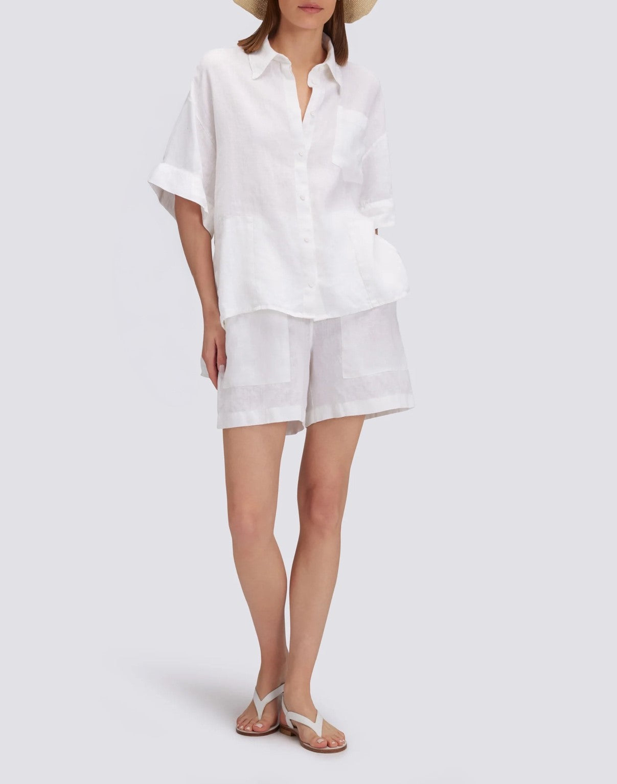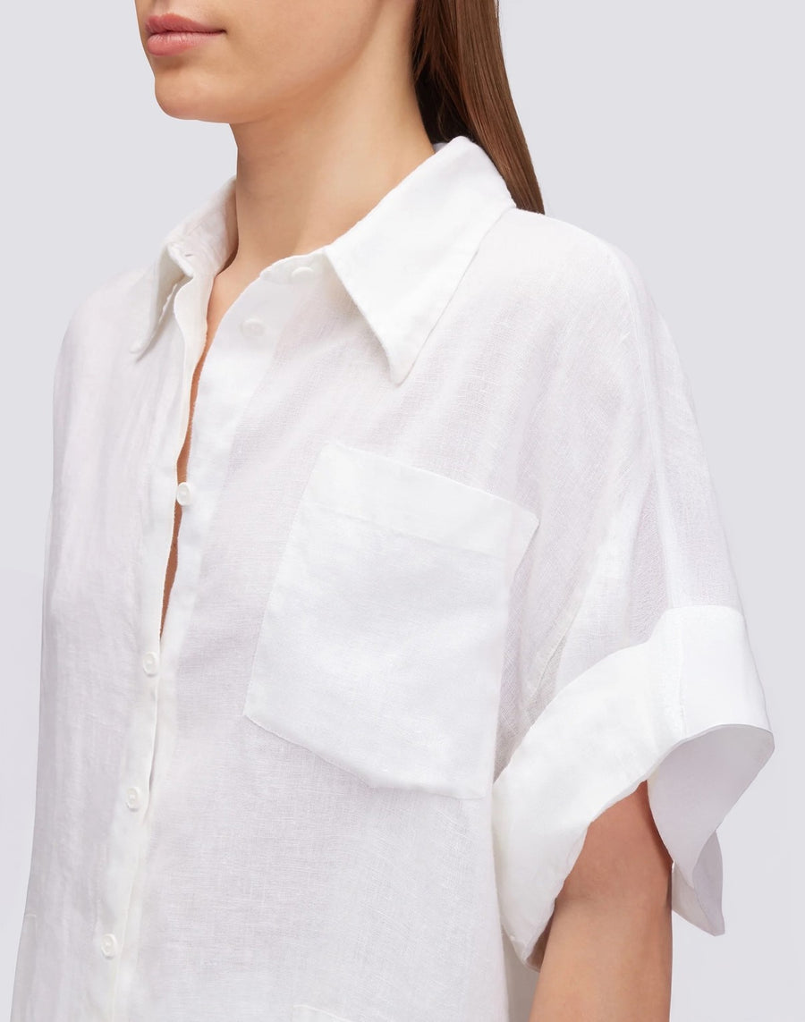 Camisa de lino teñida en prenda para mujer con lazos ajustables en las mangas y bolsillo delantero. De corte holgado y ajuste relajado, es ideal para looks frescos e informales de verano.