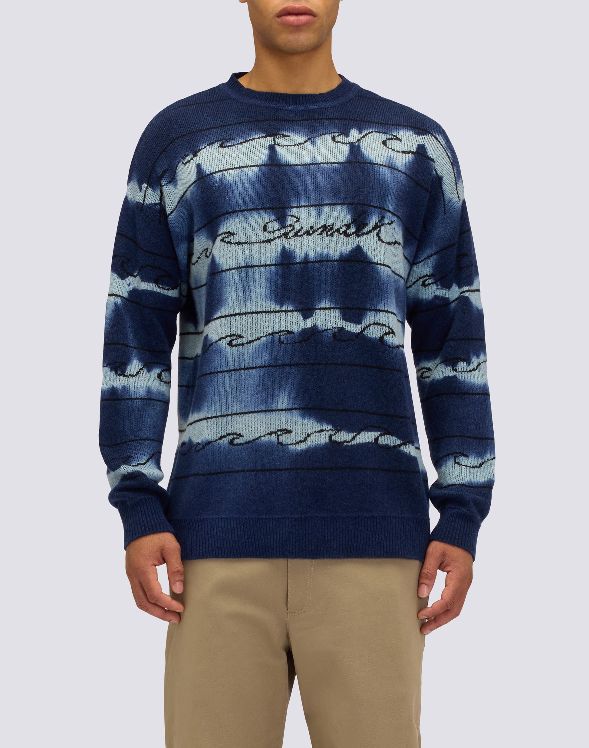 Este jersey de cachemira jacquard de cuello redondo para hombre presenta un bonito motivo ondulado, combinando así el mar, elemento fundamental de Sundek, con el invierno. Su característica más singular es su confección artesanal con la técnica de teñido Shibori, un antiguo proceso de origen japonés que deriva del verbo «shiboru» y significa «apretar», «retorcer» o «presionar». El proceso consiste en doblar, anudar, atar o coser partes de un tejido para crear reservas que bloquean el tinte, produciendo motivos abstractos y únicos.