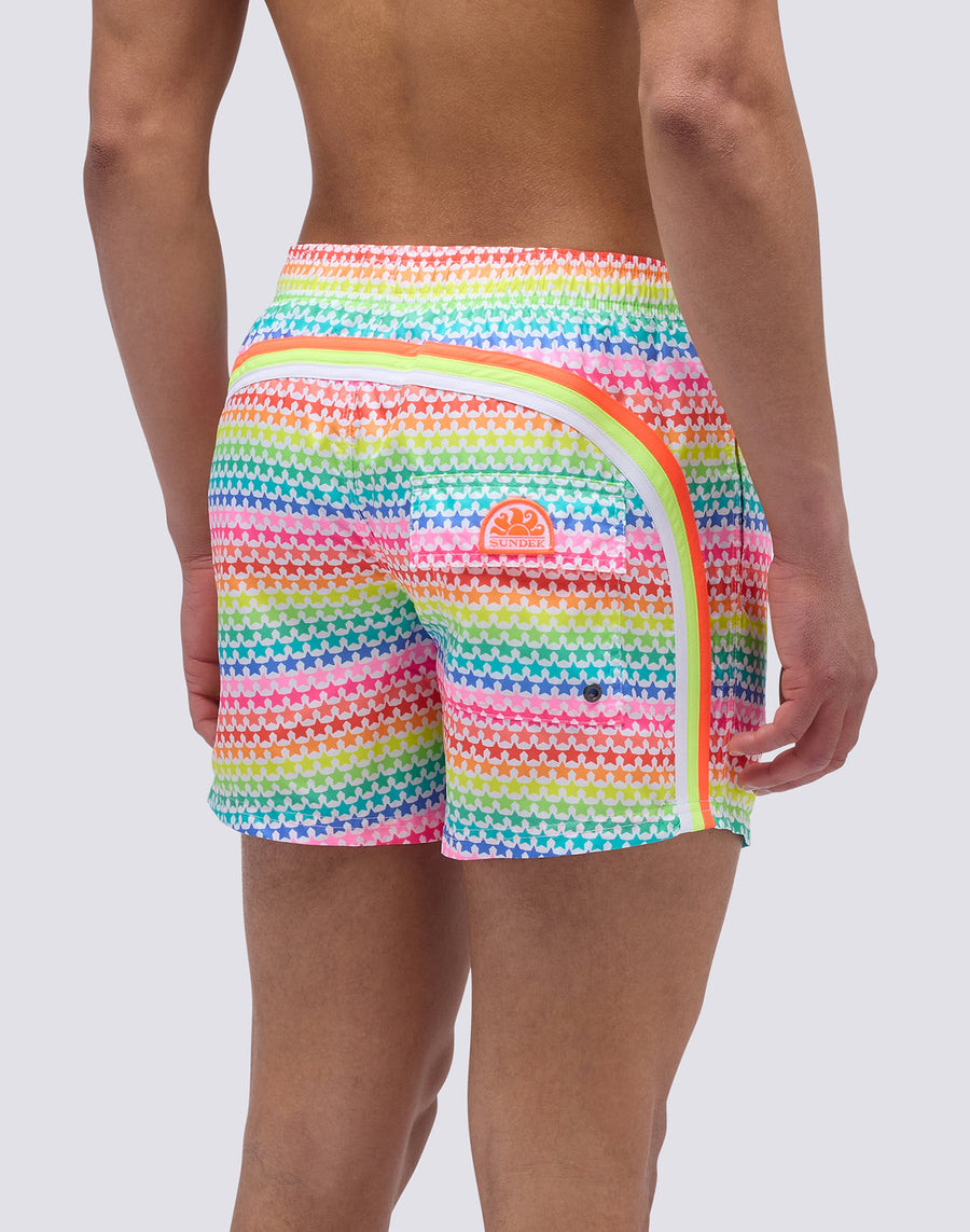 Bañador tipo short para hombre confeccionado en tejido de poliéster ligero y de secado rápido. Detalle icónico del arcoíris Sundek en la parte trasera y estampado. Longitud exterior del muslo: 35 cm (talla M).