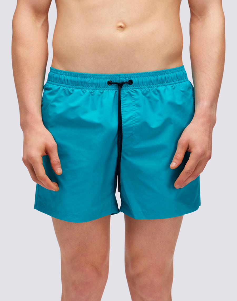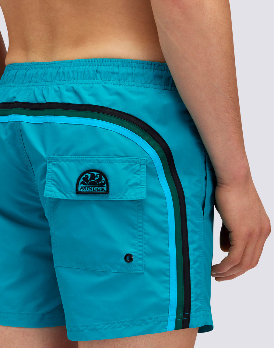 Bañador corto de hombre con cintura elástica, cordón de ajuste y el icónico arco iris de Sundek en la espalda en versión oscura. Este bañador está confeccionado con costura a tres agujas y 100% con nuestro tejido histórico, nylon-taffeta: suave como la seda, ligero y resistente a todo, se seca rápido para ofrecerte comodidad en todas partes, en las olas y fuera del agua. Longitud 35 cm (talla M), medida en el exterior de la pierna.