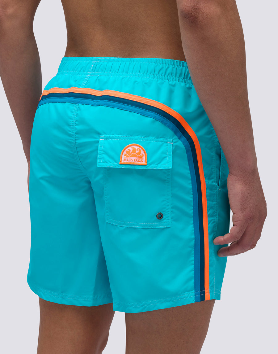 Todo el estilo Sundek atemporal en este bañador de longitud media con cintura elástica. Elegante, cómodo, construido para durar vacaciones tras vacaciones: es nuestro clásico bañador con cordón en la cintura y un arcoíris contrastante en la espalda, confeccionado en nuestra tradicional tela de tafetán de nailon que es liviana y de secado rápido, duradera, con costuras de tres agujas para un refuerzo más. Longitud 41 cm (tamaño M), medido en el lado externo de la pierna.