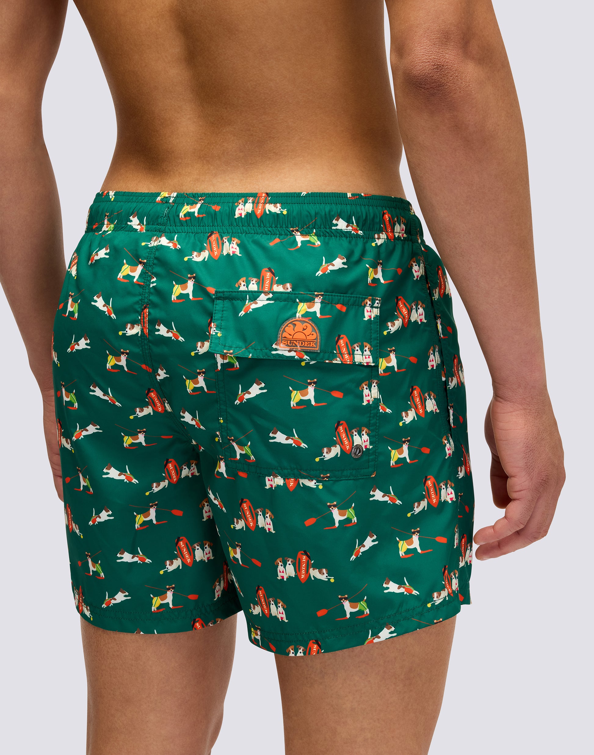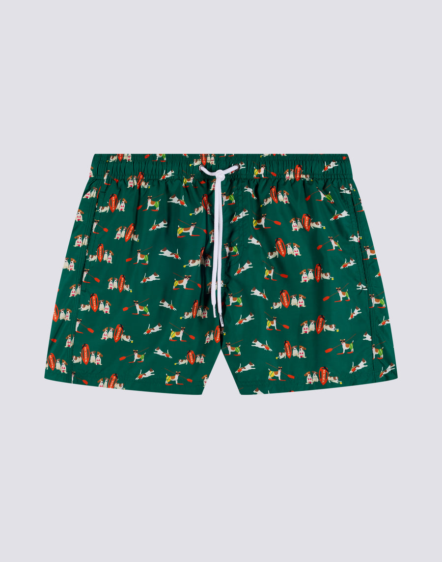Bañador para hombre de la colección cápsula Pelo, dedicada a nuestros amigos de cuatro patas. Este modelo «Playful Jack Russel» presenta un simpático Jack Russel y está confeccionado en poliéster reciclado. Perfecto para los amantes de los perros que buscan una prenda cómoda, sostenible y con un diseño único para los días de playa.