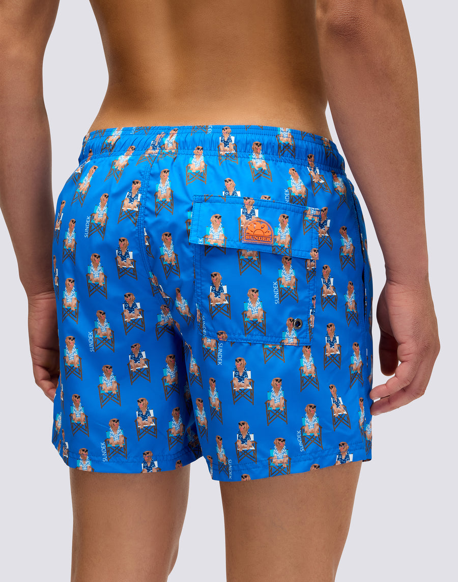 Bañador para hombre de la colección cápsula Pelo, dedicada a nuestros amigos de cuatro patas. Este modelo «Lookout Golden Retriever» presenta la raza canina del mismo nombre y está confeccionado en poliéster reciclado. Perfecto para los amantes de los perros que buscan una prenda cómoda, sostenible y con un diseño único para los días de playa.