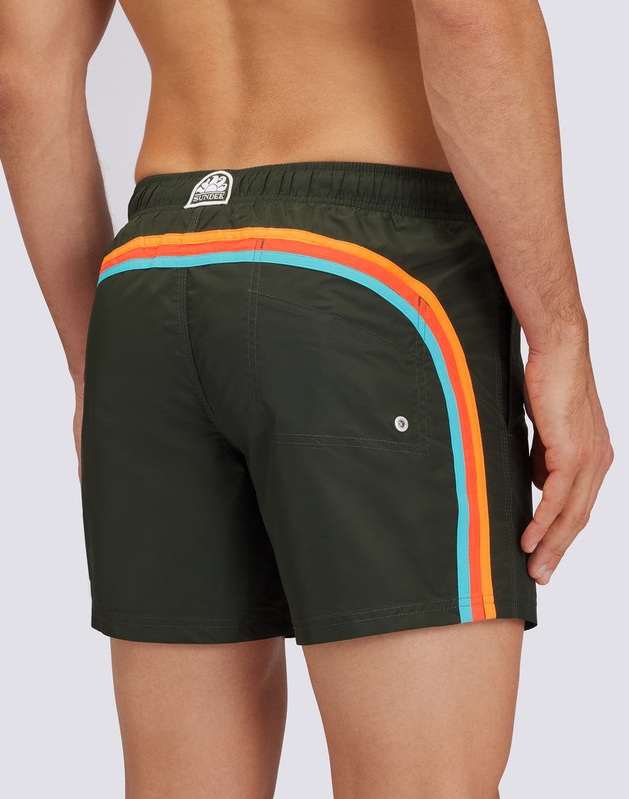 Bañador corto de hombre con cintura elástica, cordón de ajuste y el icónico arco iris de Sundek en la espalda. Este bañador está confeccionado con costura a tres agujas y 100% con nuestro tejido histórico, el nailon-taffeta: suave como la seda, ligero y resistente a todo, se seca rápido para ofrecerte comodidad en todas partes, en las olas y fuera del agua. También incorpora un bolsillo trasero oculto.