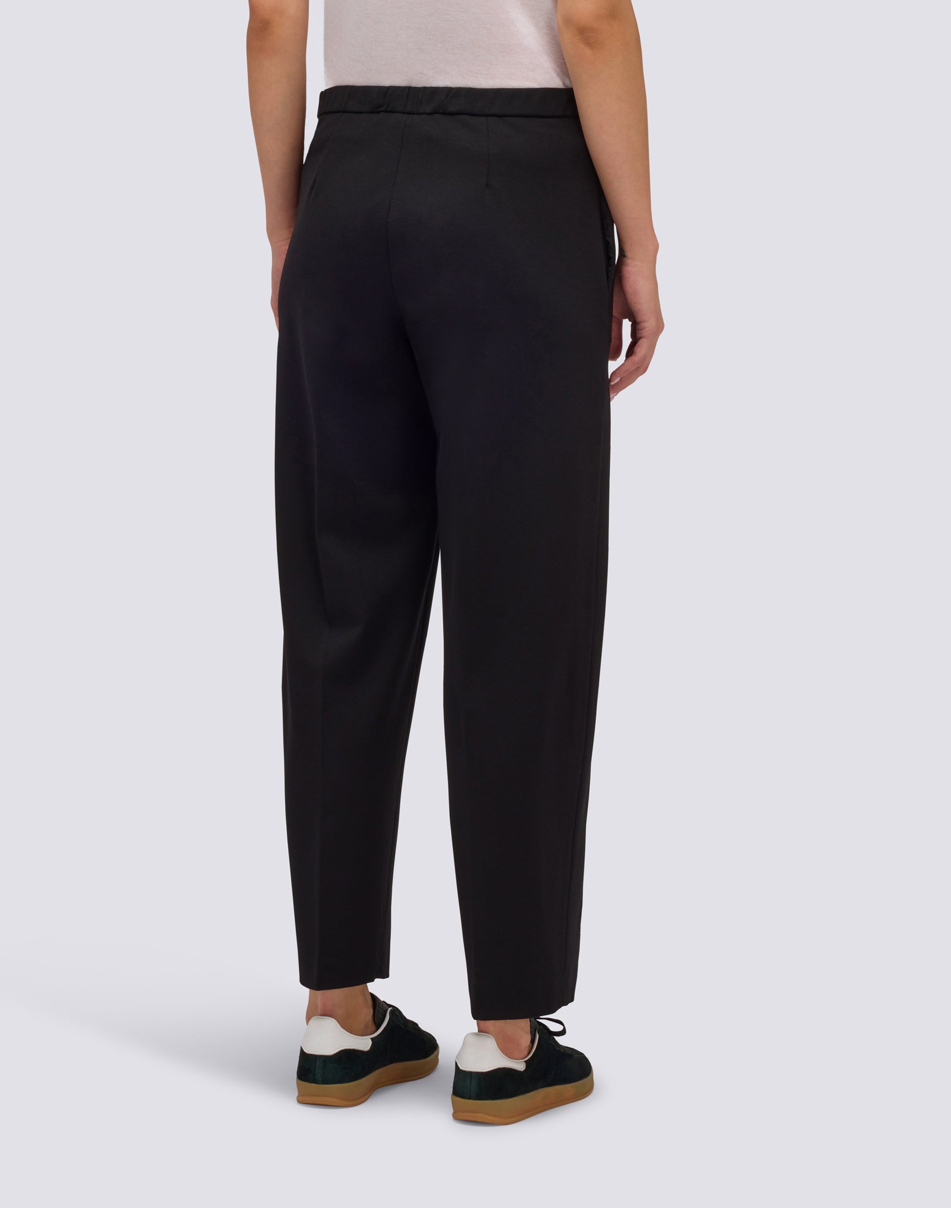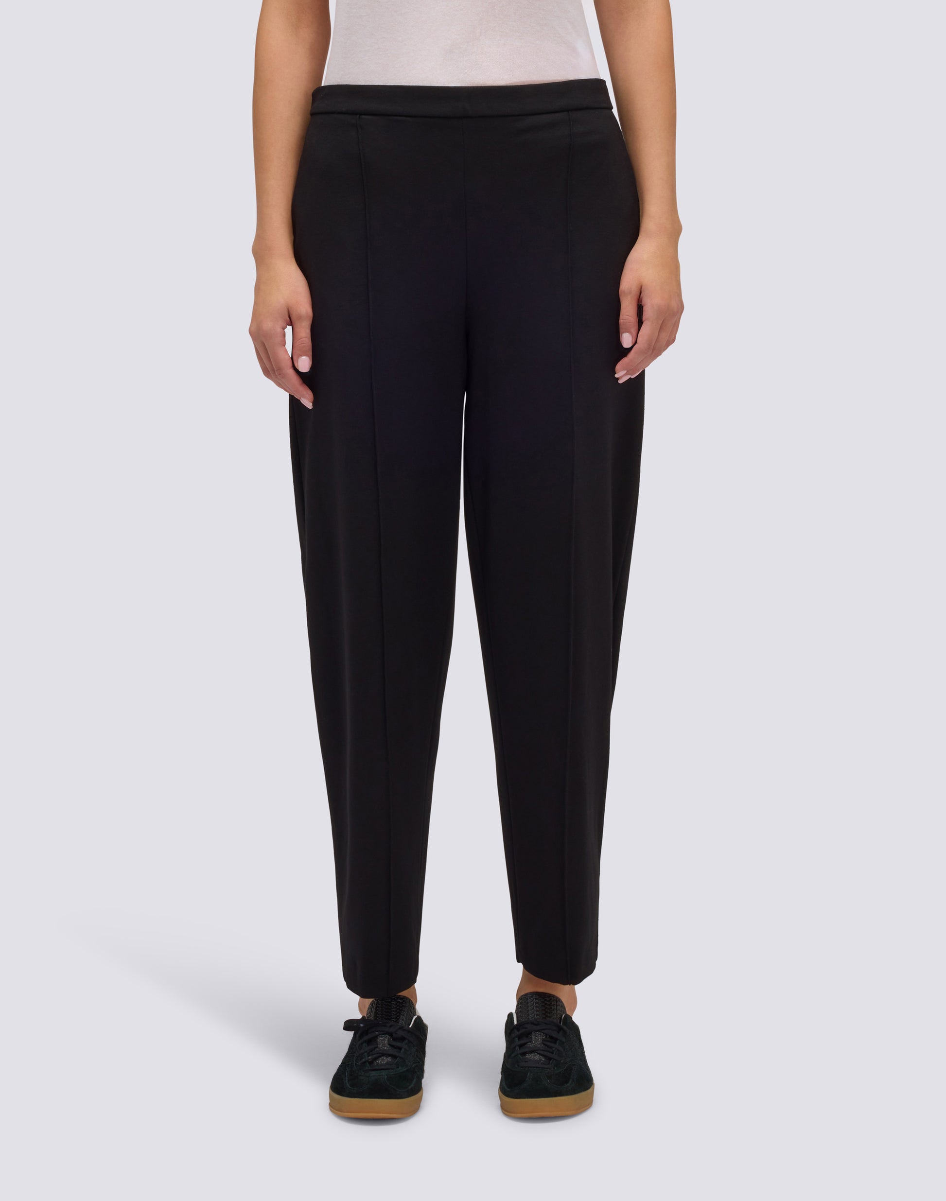 Pantalones largos de mujer en punto Milano con cintura semi elástica, pinza central delantera y bolsillos laterales. Suaves, corte holgado.
