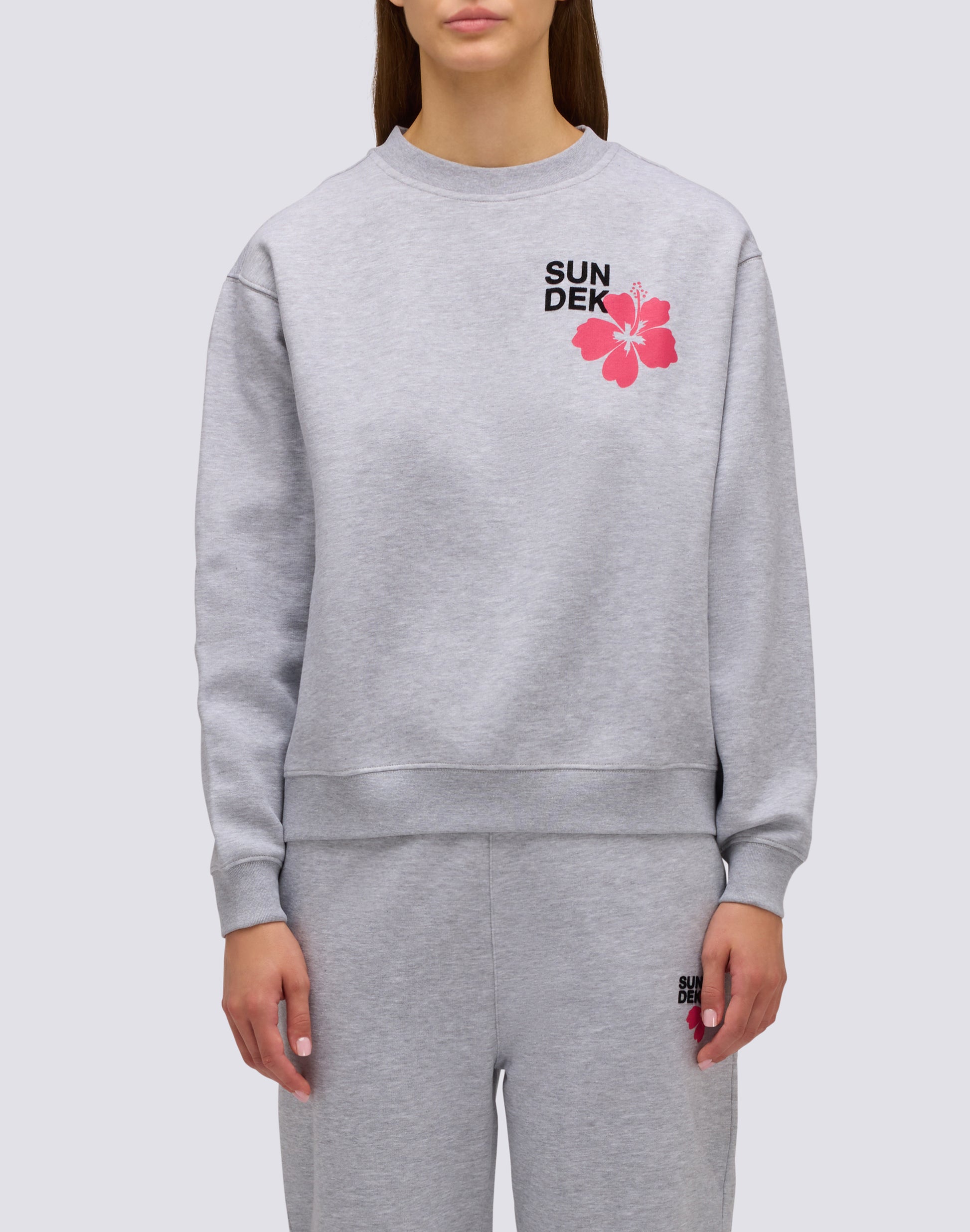 Esta sudadera de invierno para mujer con cuello redondo ofrece calidez y comodidad durante los días fríos. El diseño está realzado con la inscripción SUNDEK estampada y un delicado detalle floral, que hacen que la prenda sea versátil y femenina, ideal para un estilo informal pero cuidado.