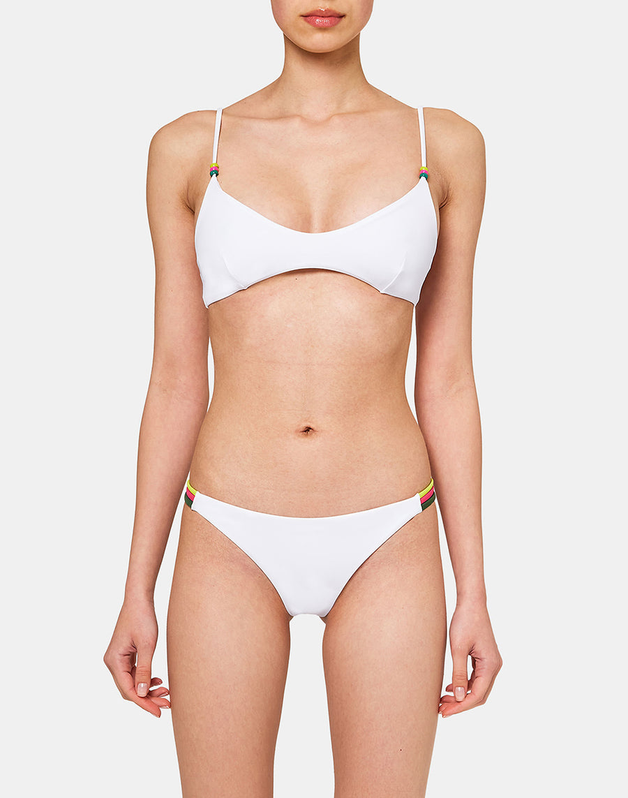 Si te gustan los modelos de última tendencia, puedes optar por este bikini compuesto por un top bralette con relleno y cuentas multicolor, y una braguita brasileña con bandas tricolor en los laterales.