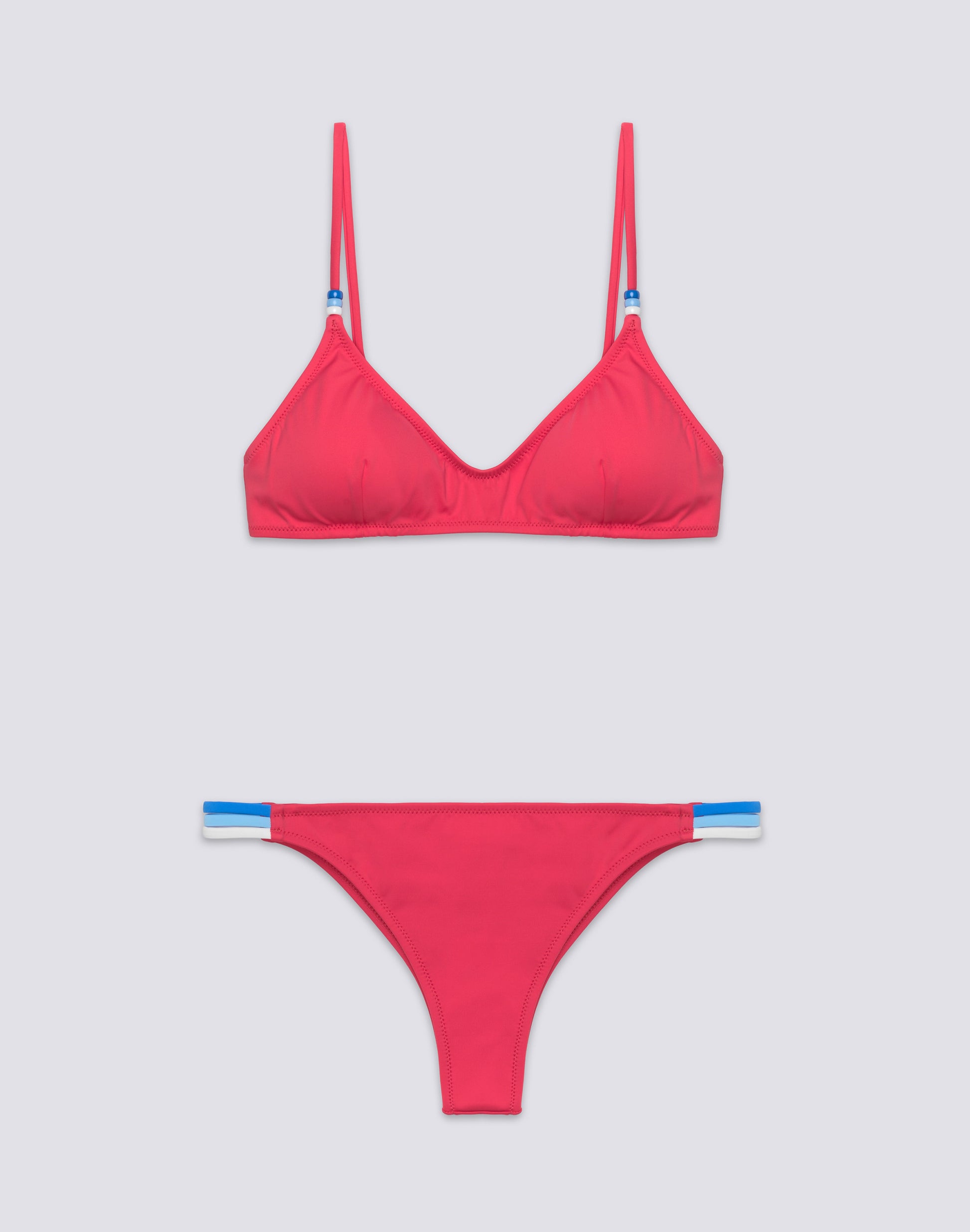 El bikini W818KNL30RB es un modelo que combina estilo y detalles distintivos: top bralette acolchado con cuentas multicolores y braguita brasileña con bandas tricolores en los laterales. Para quienes buscan un look de playa que destaque. El top bralette acolchado ofrece sujeción natural y comodidad sin aros. El relleno moldea la silueta garantizando cobertura y seguridad, mientras que el diseño bralette proporciona un ajuste femenino. Cuentas multicolores: el detalle que marca la diferencia Las cuentas multicolores del top añaden un toque divertido que capta la luz y la atención. Este detalle transforma un bikini clásico en una prenda con personalidad, perfecta para quienes aman destacar en la playa con un toque de carácter. La braguita brasileña ofrece el equilibrio perfecto entre cobertura y sensualidad. Más cubierta que el tanga pero más escotada que la clásica, este corte realza la silueta con elegancia. Las bandas tricolores en los laterales de la braguita son el sello icónico de Sundek, lo que hace que el bikini sea inmediatamente reconocible.
