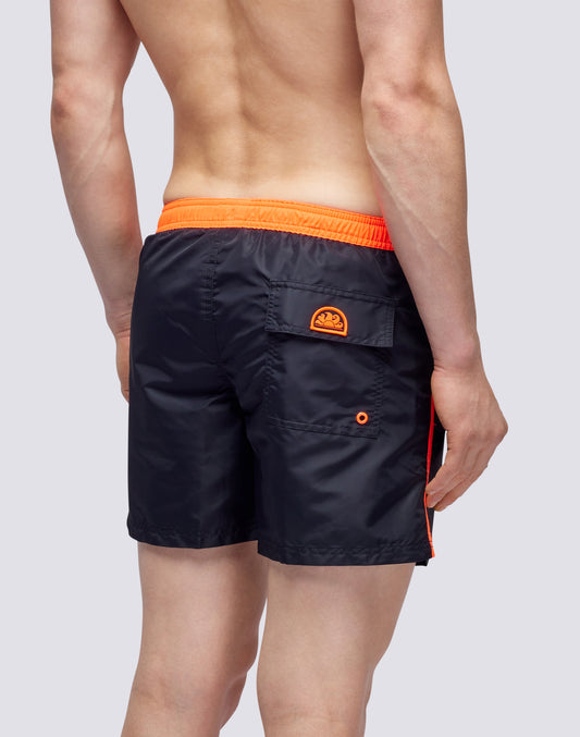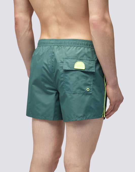 MAILLOT DE BAIN COURT À TAILLE ÉLASTIQUÉE EN TAFFETAS ICONIQUE AVEC PASSEPOILS CONTRASTÉS