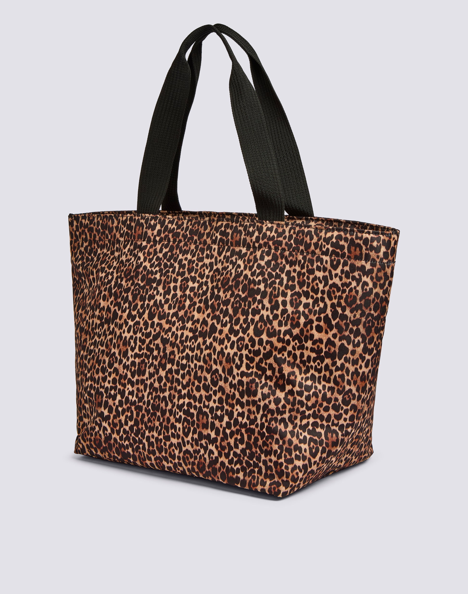 Sac fourre-tout de taille standard à motif léopard avec fermeture à glissière et poignées. Pour rendre même les tenues les plus basiques extravagantes.
