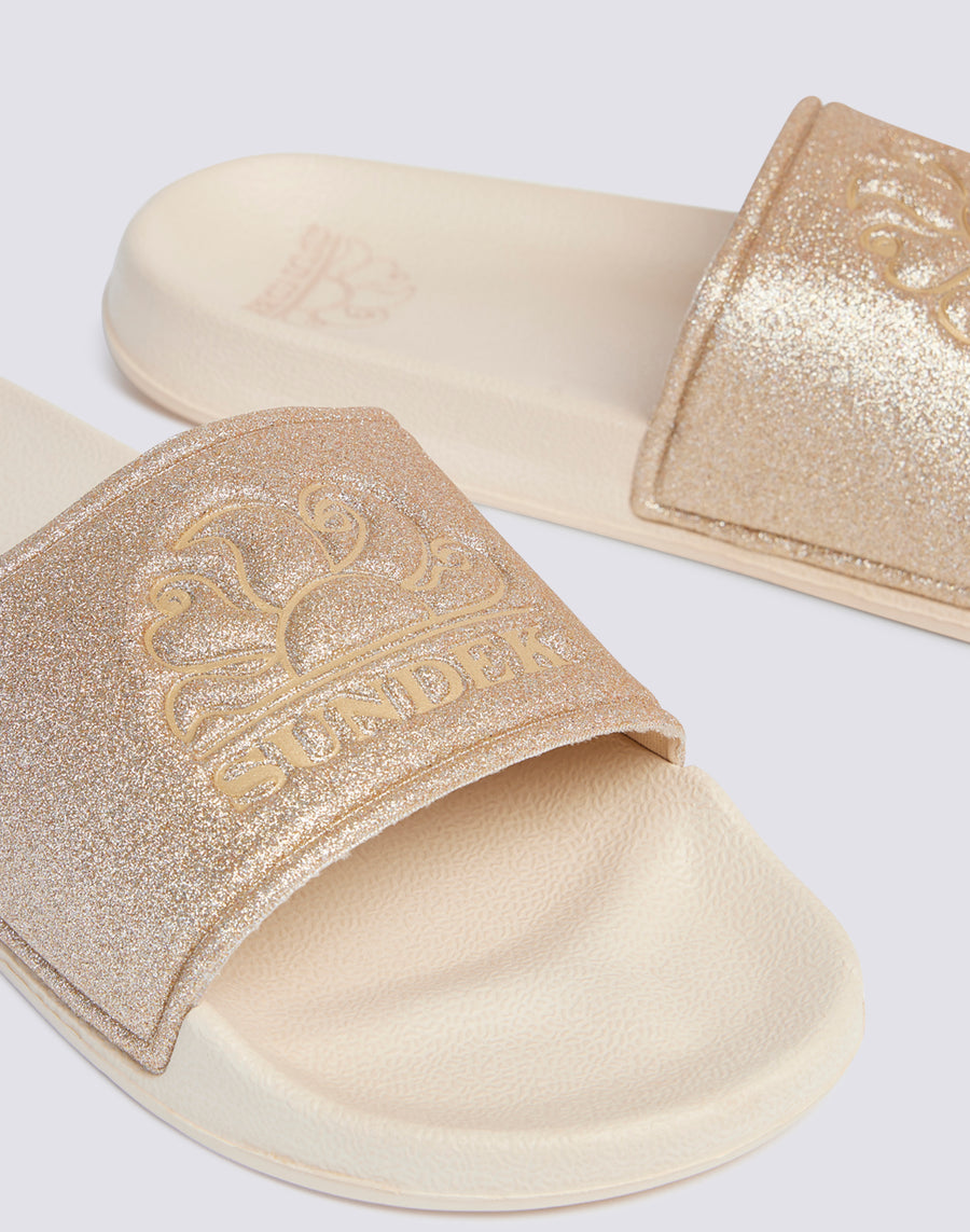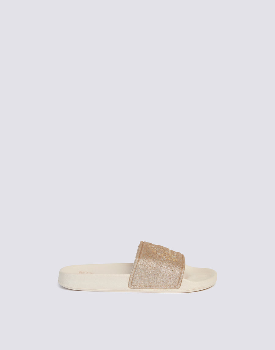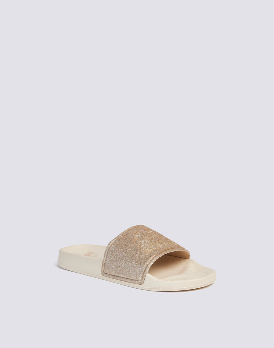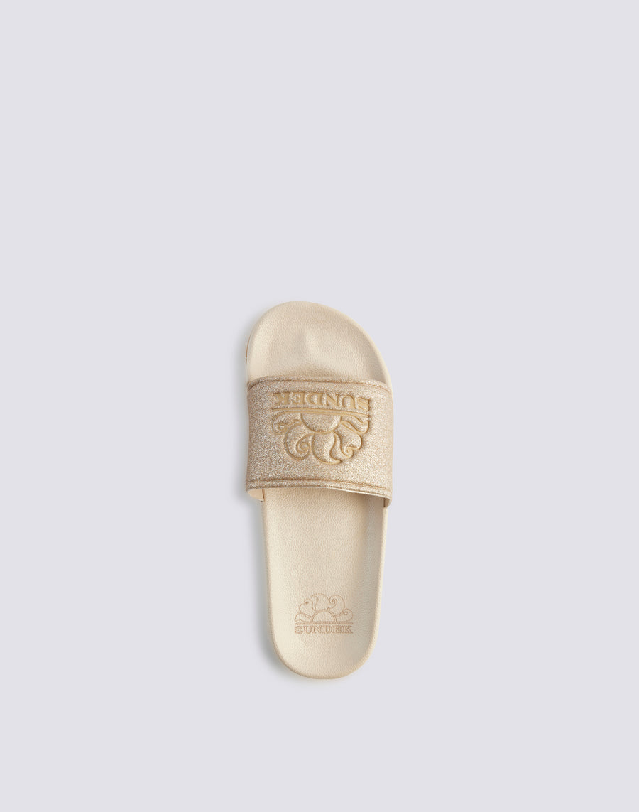 Mules de plage avec bande effet paillettes, pour la plage, la piscine et pour toutes les occasions où l'on ne renonce pas à allier confort et style.