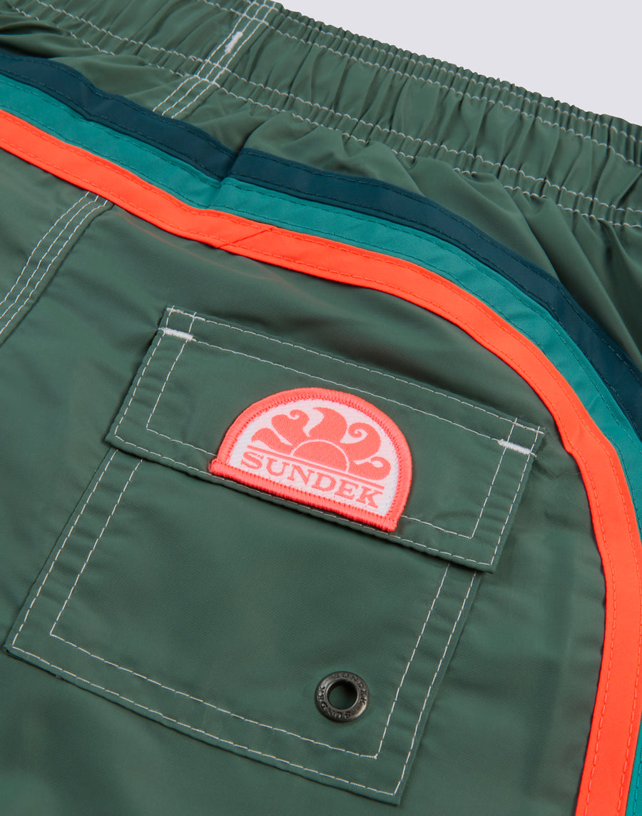 Couleur intense et matière hyper confortable à séchage rapide pour ce short de bain garçon. Un modèle qui accompagnera votre enfant dans ses mille activités de vacances, parfait pour bouger et jouer en toute liberté. il est fabriqué à partir de notre tissu en taffetas de nylon héritage et construit avec des coutures à trois aiguilles qui le rendent durable dans le temps. À ranger dans sa valise, année après année.