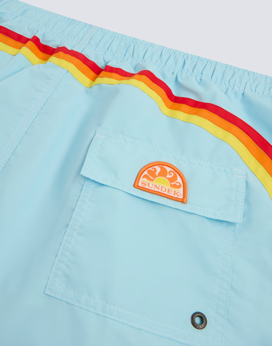 Short de bain court pour homme avec taille élastiquée, cordon de serrage et arc-en-ciel emblématique Sundek dans le dos. Ce maillot de bain est réalisé avec des coutures à trois aiguilles et 100% de notre tissu historique, le nylon-taffetas : doux comme de la soie, léger et résistant à tout, il sèche très rapidement pour vous offrir un confort partout, dans les vagues et en dehors des cascades. Longueur 35 cm (taille M), mesurée à l'extérieur de la jambe.