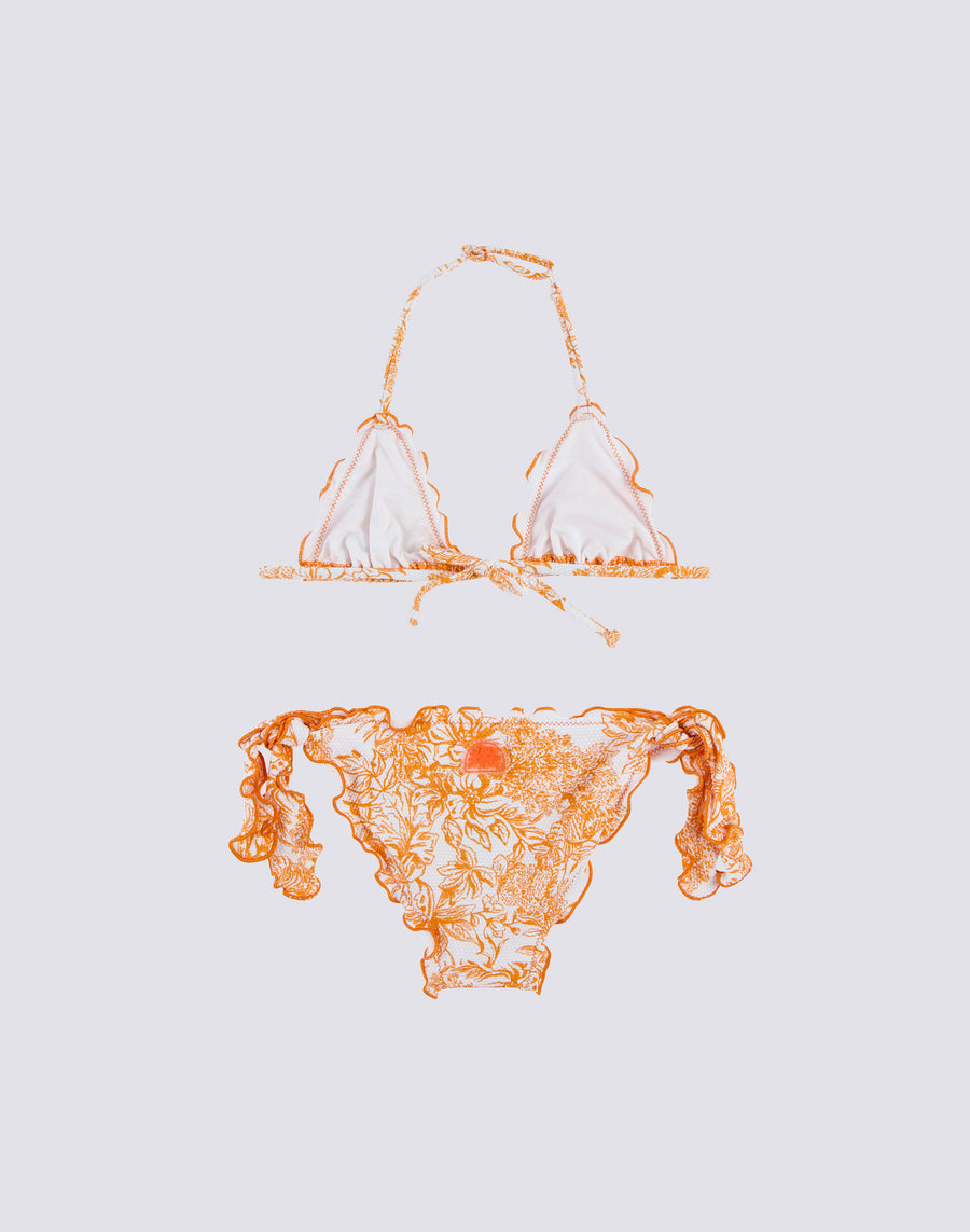 Mini bikini Magnolia composé d'un haut triangle froncé ajustable et d'une culotte froncée avec nœuds. Imprimé Fleur de Joie et tissu Piquet. Modèle assorti avec celui de maman pour afficher un look mix & match sur la plage.
