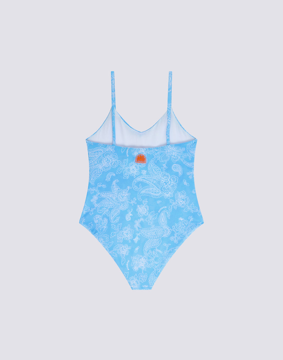Maillot de bain une pièce pour fille à motif Hibi Paisley style bandana, avec décolleté en V sur le devant et dos assez ouvert.