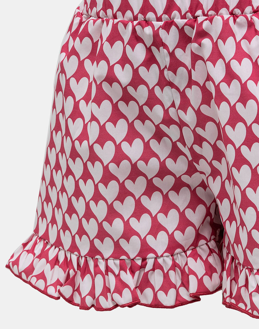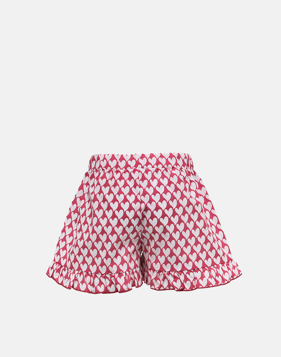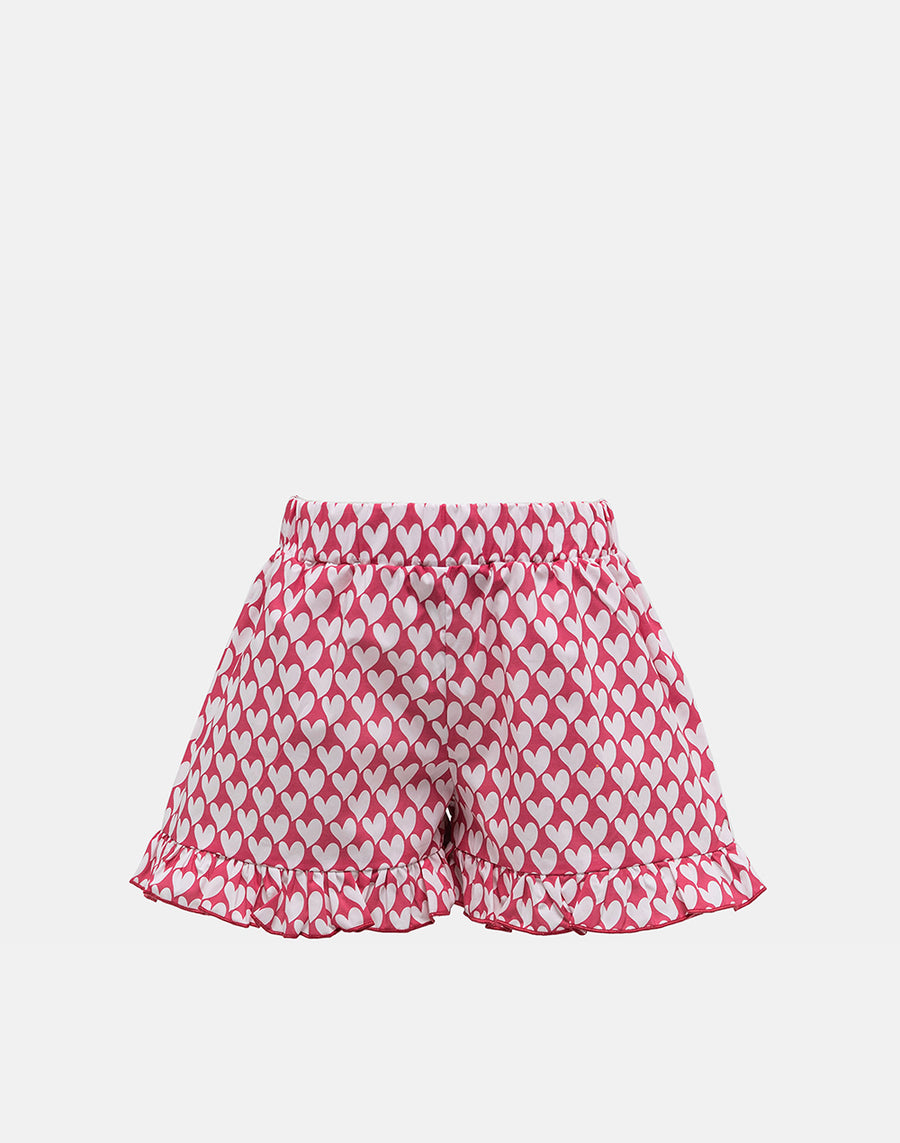 Il apporte une touche ludique et raffinée à ton style en toutes circonstances. Le short en popeline de coton stretch est orné d'un imprimé cœur allover et de ruché en bas.