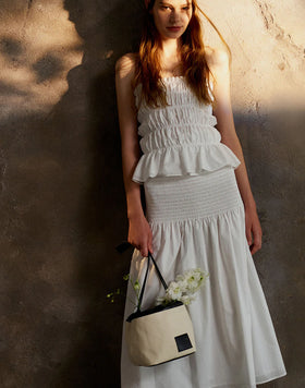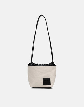 Sac seau en toile de coton avec détails contrastés en similicuir, à porter à l'épaule ou en bandoulière.
