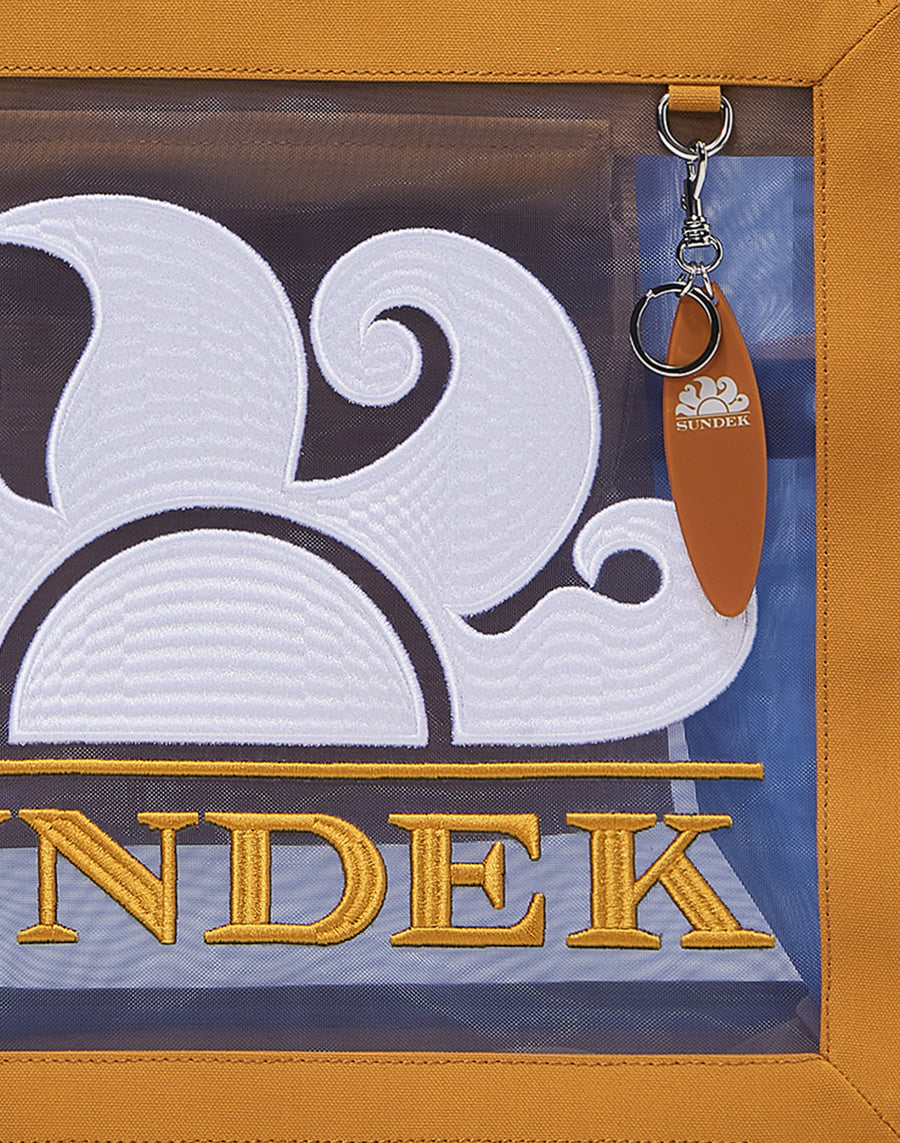 Sac en mesh avec logo Sundek brodé. Ce sac est parfait pour la plage grâce à son filet à mailles fines qui empêche le passage du sable. Avec charm en forme de planche de surf.