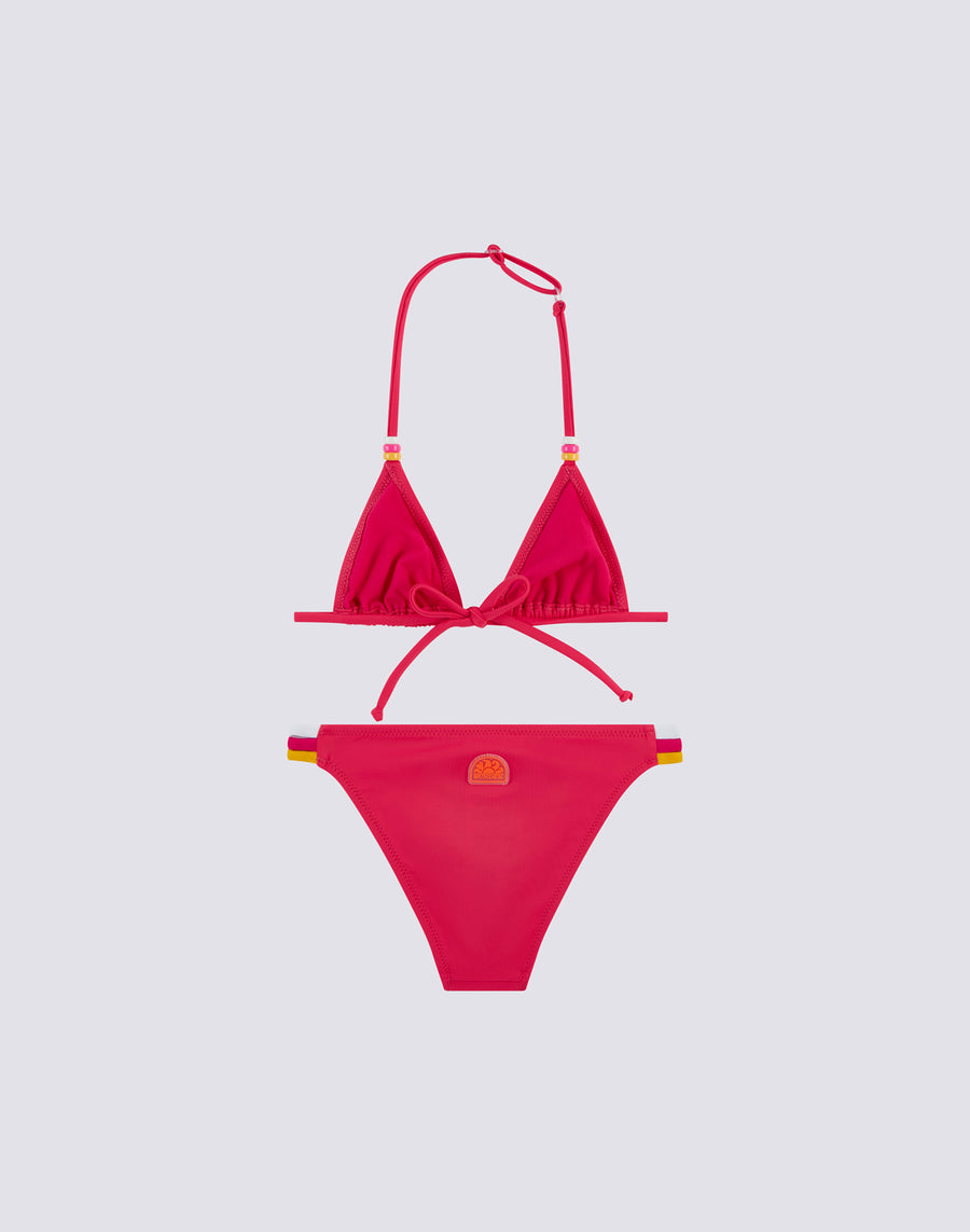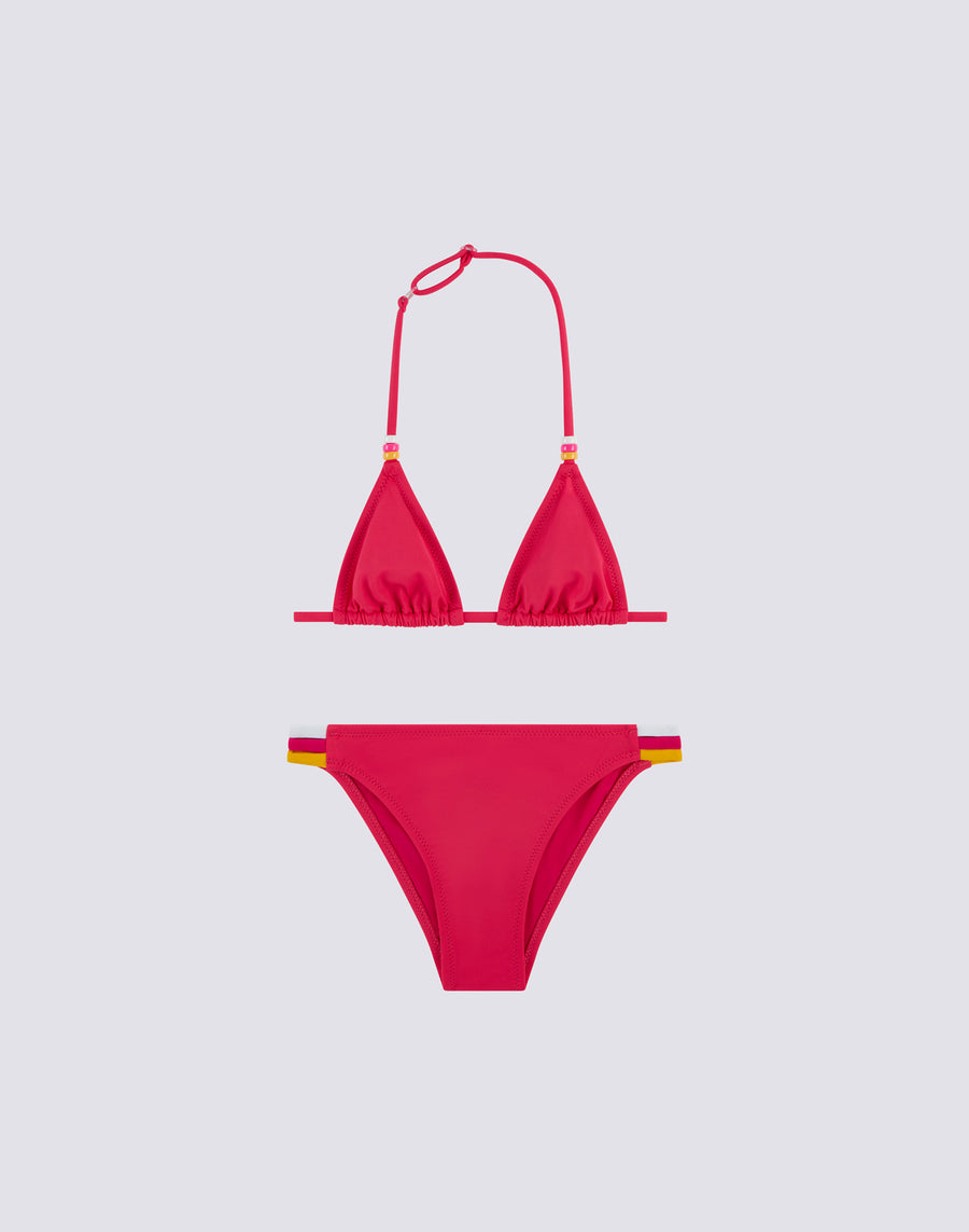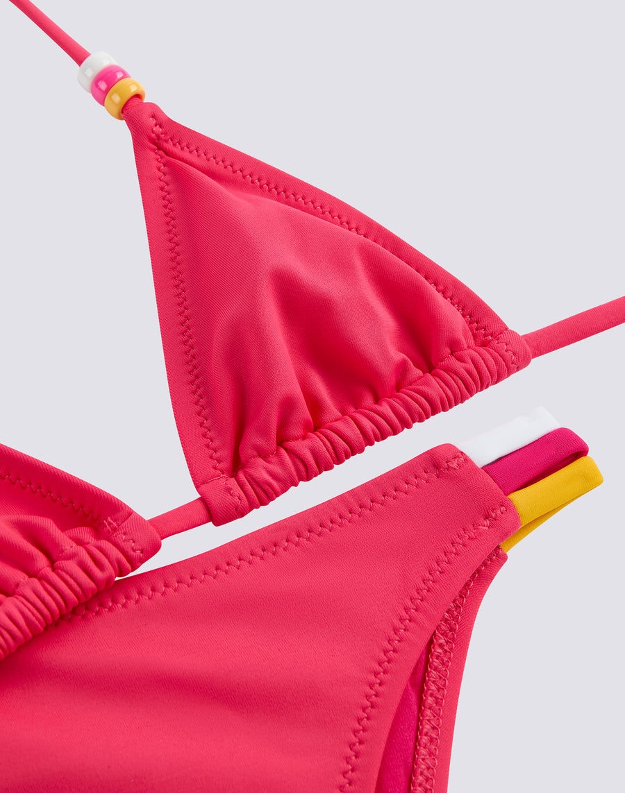 Bikini de bain pour fille composé d'un haut triangulaire ajustable avec des liens à l'arrière du cou, orné de perles tricolores. Les trois couleurs des perles sont répétées sur le détail tricolore sur le côté du bas du bikini. Le maillot de bain deux pièces est fabriqué dans le tissu VITA by Carvico, confortable, résistant et qui ne craint pas le chlore et les crèmes solaires.