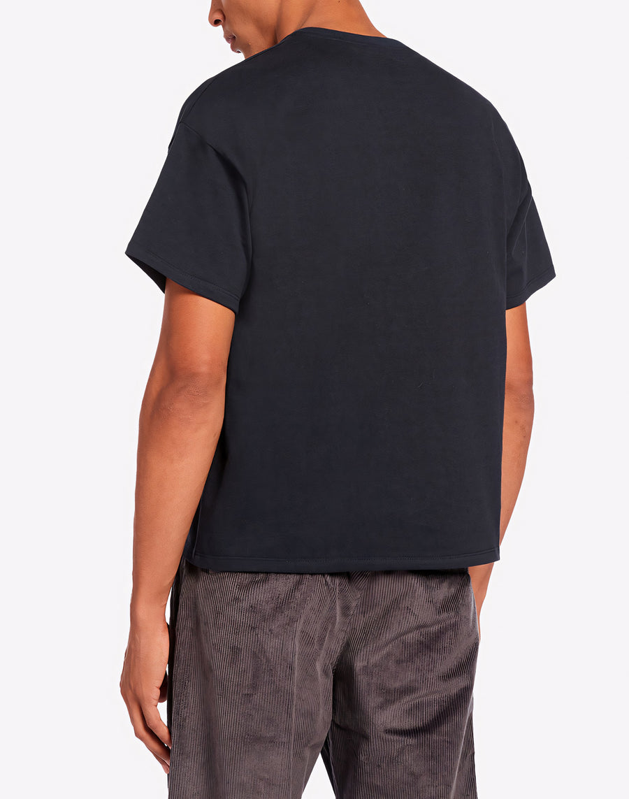 Un t-shirt oversize à col rond, à porter où et quand on le souhaite, à la ville ou en voyage. Logo en laine cousu main sur la poitrine.