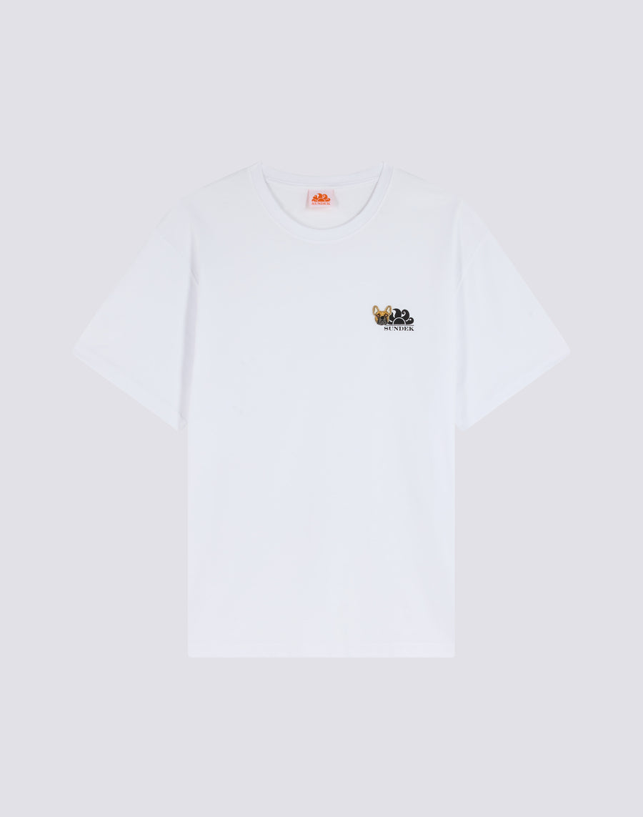 T-shirt en coton issu de la capsule exclusive de la Fondation Sundek & Pelo. Ce modèle représente un adorable bouledogue français, alliant passion pour la mer et affection pour nos amis les animaux.