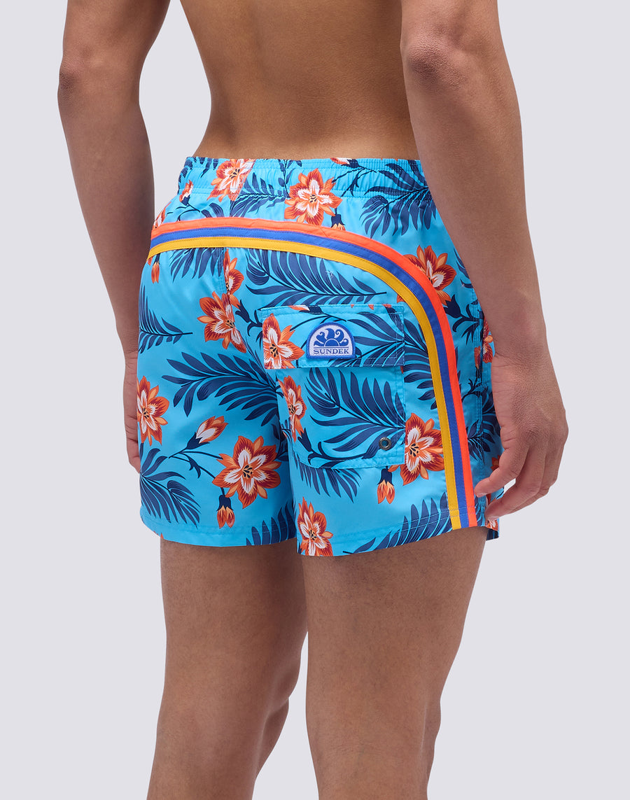 Maillot de bain pour homme en tissu polyester léger et à séchage rapide. Détail arc-en-ciel emblématique Sundek au dos et imprimé. Longueur extérieure de la cuisse 14”/35 CM (en taille M).