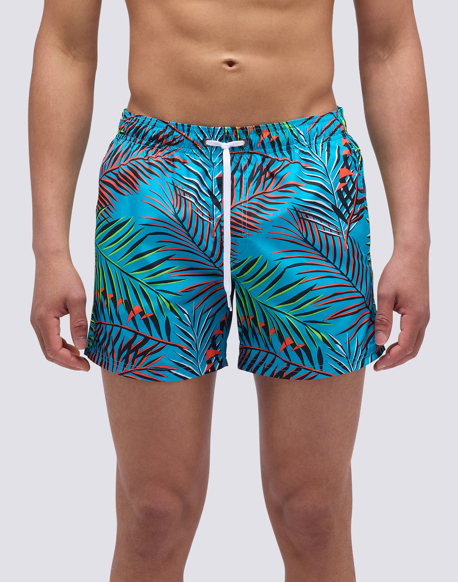 MAILLOT DE BAIN COURT À TAILLE ÉLASTIQUE ET IMPRIMÉ FEUILLES FLUO