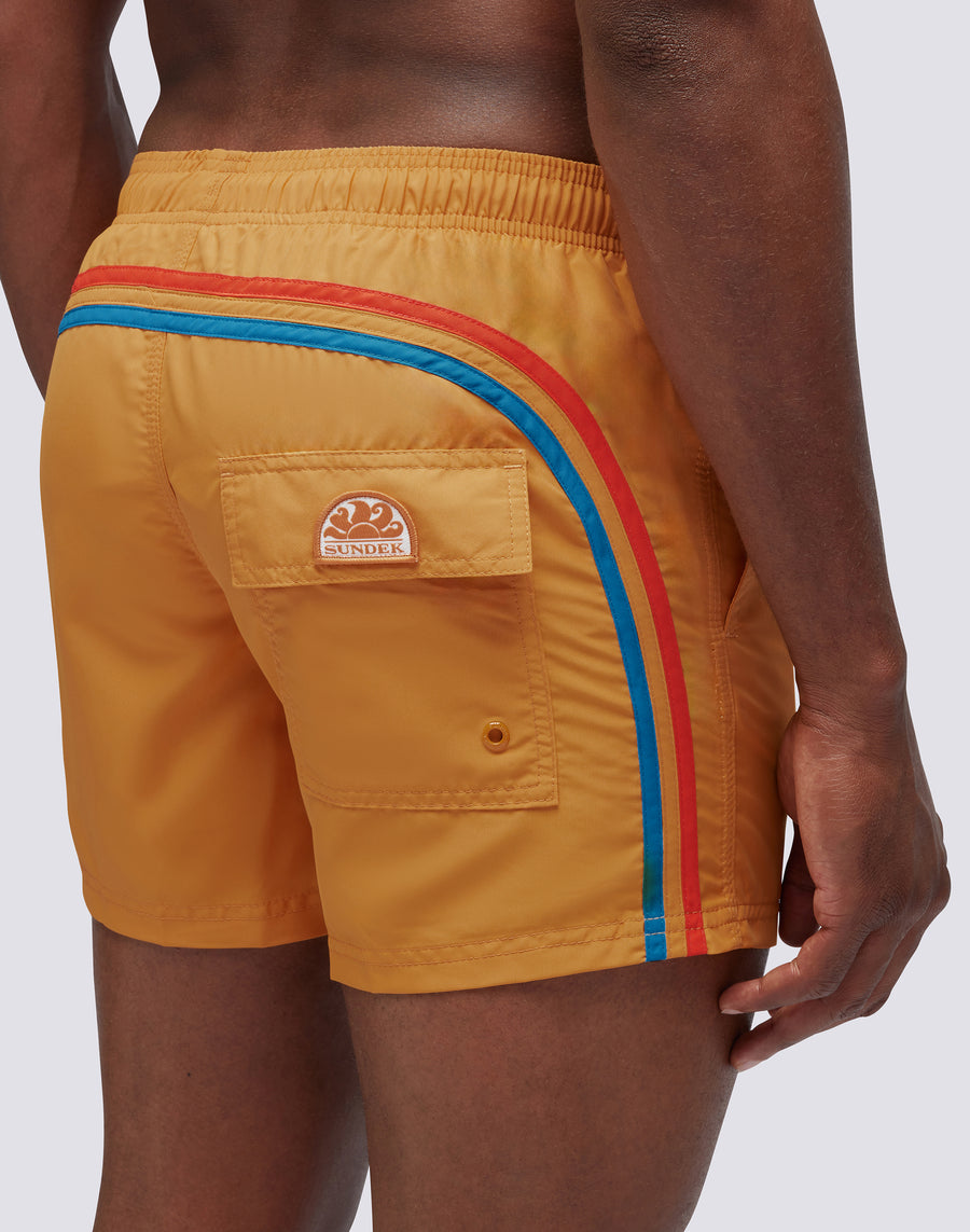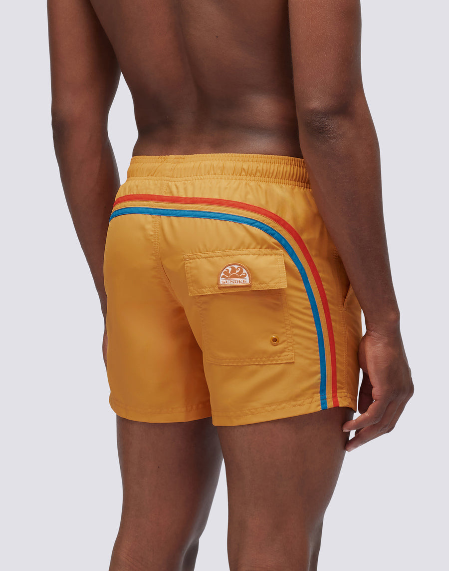 Il est amusant, brillant et respectueux de l'environnement : le maillot de bain boxer arc-en-ciel pour homme est fabriqué en polyester REPREVE® à partir de bouteilles en plastique recyclées. Durabilité et performance vont de pair, car il s'agit d'un tissu léger qui sèche rapidement. De plus, la couture à trois aiguilles qui termine le motif garantit la durabilité. À emballer immédiatement.