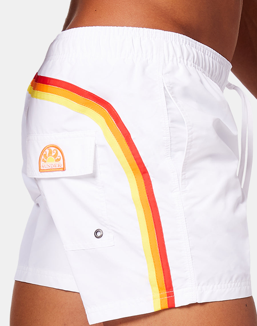 Short de bain pour homme avec ceinture élastiquée, cordon de serrage et arc-en-ciel emblématique de Sundek dans le dos. Ce maillot de bain est réalisé avec des coutures à trois aiguilles et 100% avec notre tissu historique, le nylon-taffeta : soyeux, léger et résistant à tout, il sèche rapidement pour vous donner du confort partout, dans les vagues et hors de l'eau.