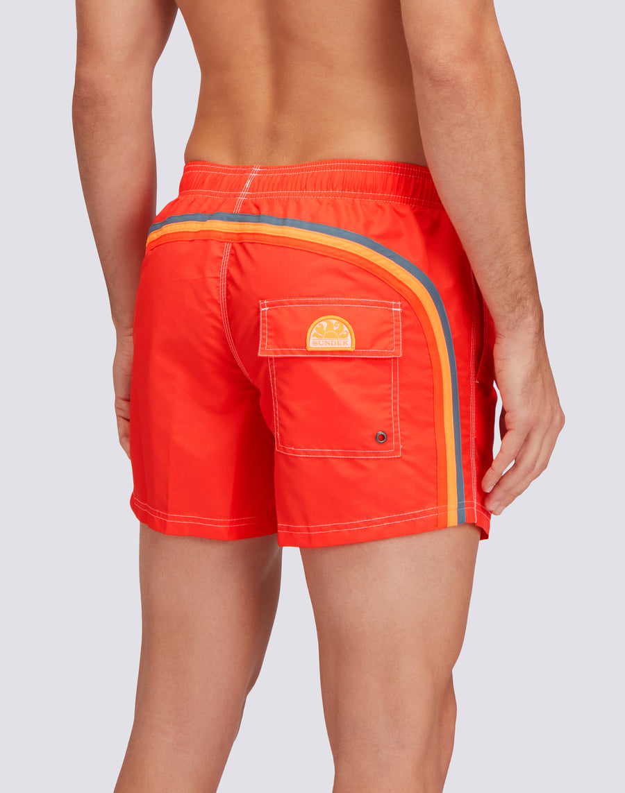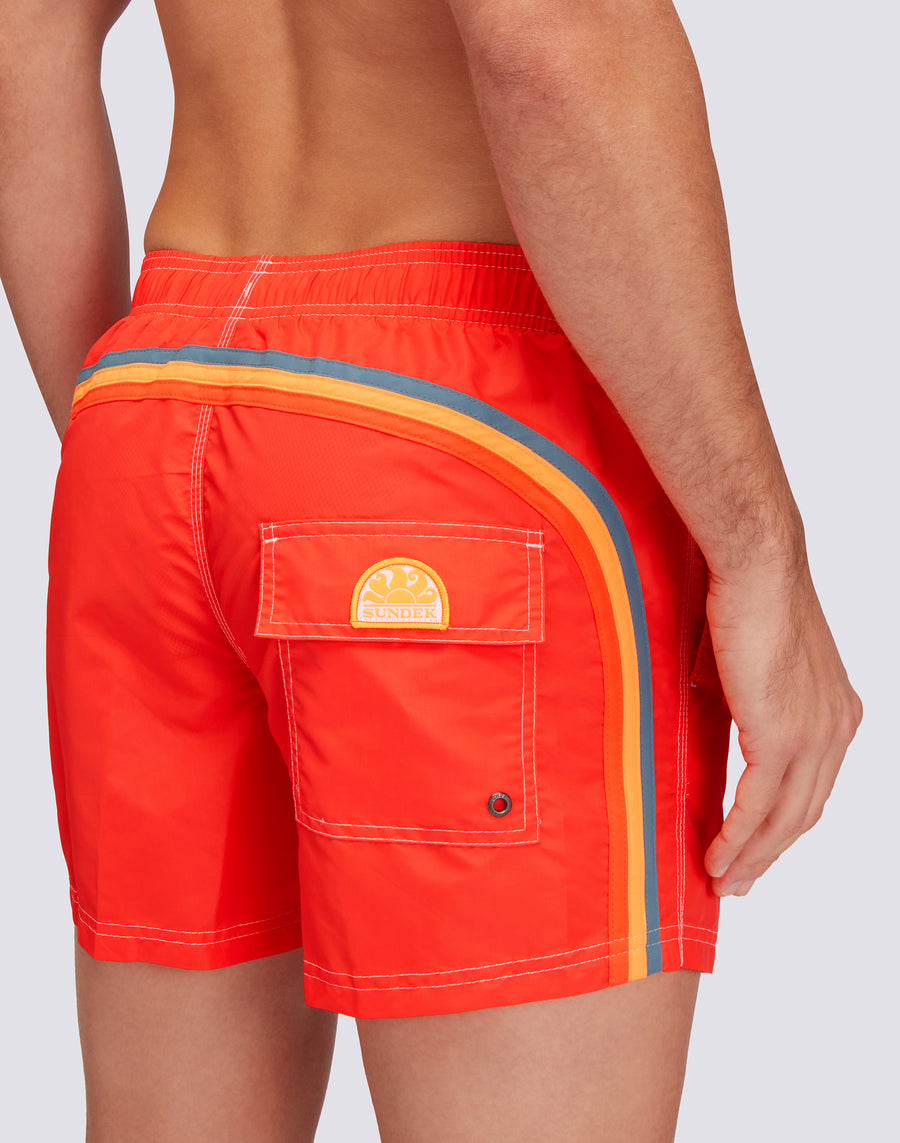 Short de bain court pour homme avec taille élastiquée, cordon de serrage et arc-en-ciel emblématique Sundek dans le dos. Ce maillot de bain est réalisé avec des coutures à trois aiguilles et 100% de notre tissu historique, le nylon-taffetas : doux comme de la soie, léger et résistant à tout, il sèche très rapidement pour vous offrir un confort partout, dans les vagues et en dehors des cascades. Longueur 35 cm (taille M), mesurée à l'extérieur de la jambe.