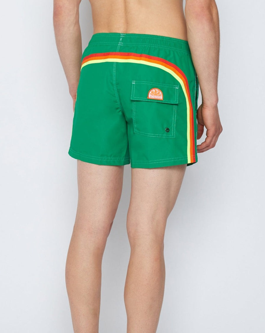 Short de bain pour homme avec ceinture élastiquée, cordon de serrage et arc-en-ciel emblématique de Sundek dans le dos. Ce maillot de bain est réalisé avec des coutures à trois aiguilles et 100% avec notre tissu historique, le nylon-taffetas : soyeux, léger et résistant à tout, il sèche rapidement pour vous donner du confort partout, dans les vagues et hors de l'eau.