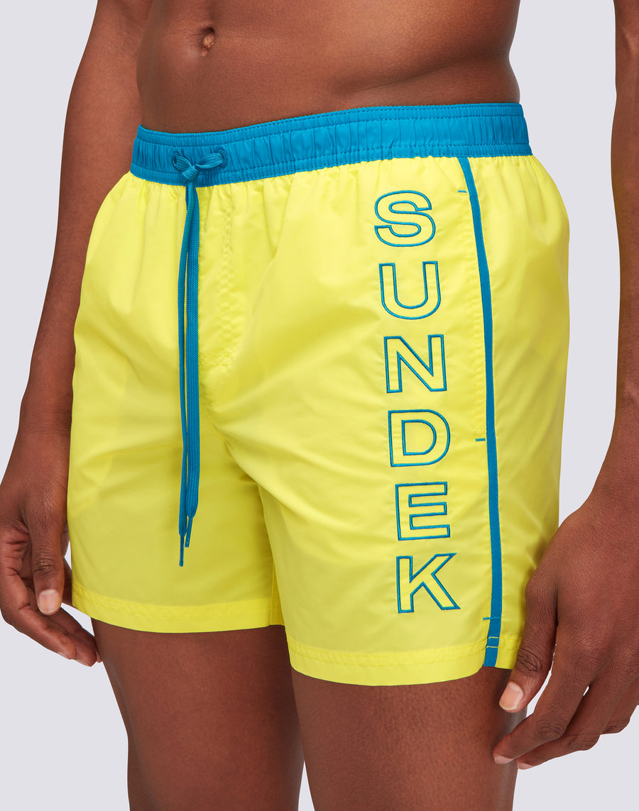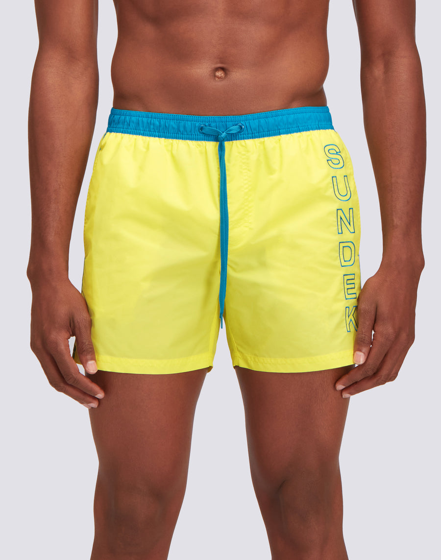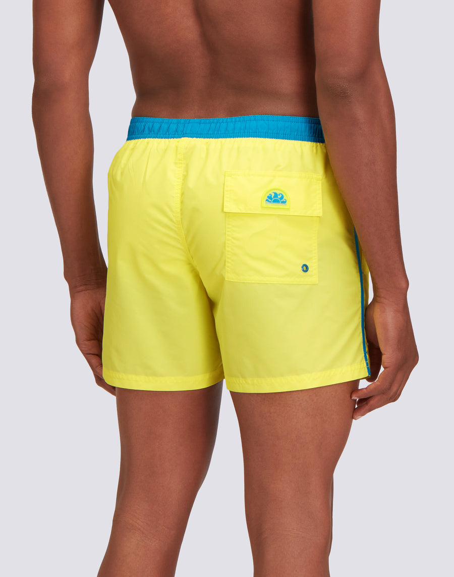 MAILLOT DE BAIN COURT À TAILLE ÉLASTIQUÉE EN TAFFETAS ICONIQUE AVEC PASSEPOILS CONTRASTÉS