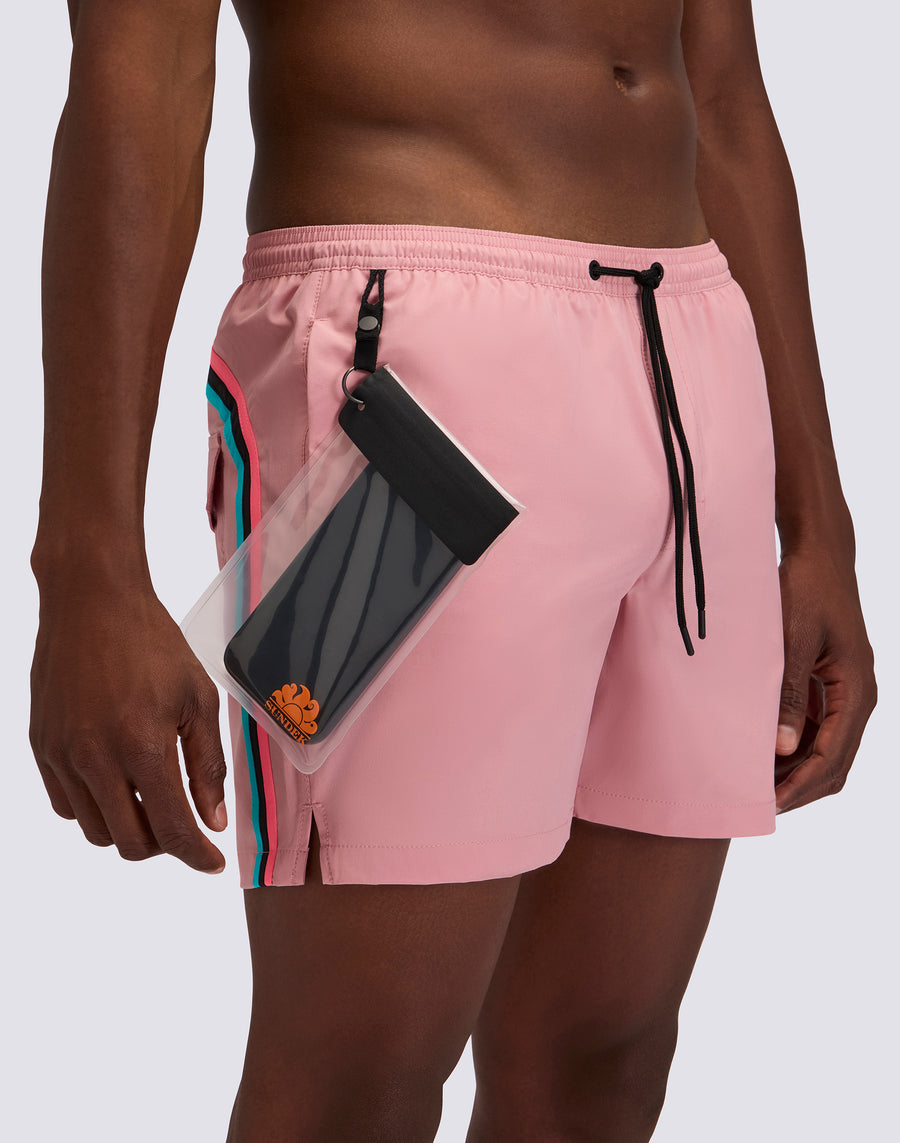Ce maillot de bain pour homme est une véritable innovation : fabriqué en tissu extensible 4 Way Stretch et doté d'une pochette imperméable amovible pour le téléphone portable, il allie une liberté de mouvement maximale et une praticité absolue. Ce boardshort pour homme est parfait pour ceux qui ne veulent jamais se séparer de leur smartphone, même à la plage. La pochette imperméable amovible, qui s'attache à la taille comme un porte-clés, est la solution idéale pour emporter votre téléphone portable sans avoir à utiliser de poches encombrantes ou de sacs externes. Entièrement imperméable, elle protège votre smartphone et vous permet d'immortaliser chaque instant passé à la plage ou simplement d'avoir votre téléphone toujours à portée de main. Le tissu extensible 4 Way Stretch s'étire dans toutes les directions, garantissant une liberté de mouvement sans précédent. Parfait pour le surf, la natation, le beach-volley et les sports nautiques intenses, ce tissu technique s'adapte parfaitement au corps en suivant chaque mouvement sans aucune restriction. Léger, résistant et à séchage ultra-rapide, il offre un confort continu dans et hors de l'eau. Disponible dans des couleurs vives unies, ce maillot de bain allie esthétique contemporaine et fonctionnalité. Son design épuré et sportif s'adapte parfaitement à un mode de vie actif et connecté, tandis que l'arc-en-ciel emblématique de Sundek au dos témoigne de l'héritage de la marque. Les coutures à trois aiguilles garantissent résistance et durabilité. La taille élastiquée avec cordon de serrage offre un ajustement personnalisé.