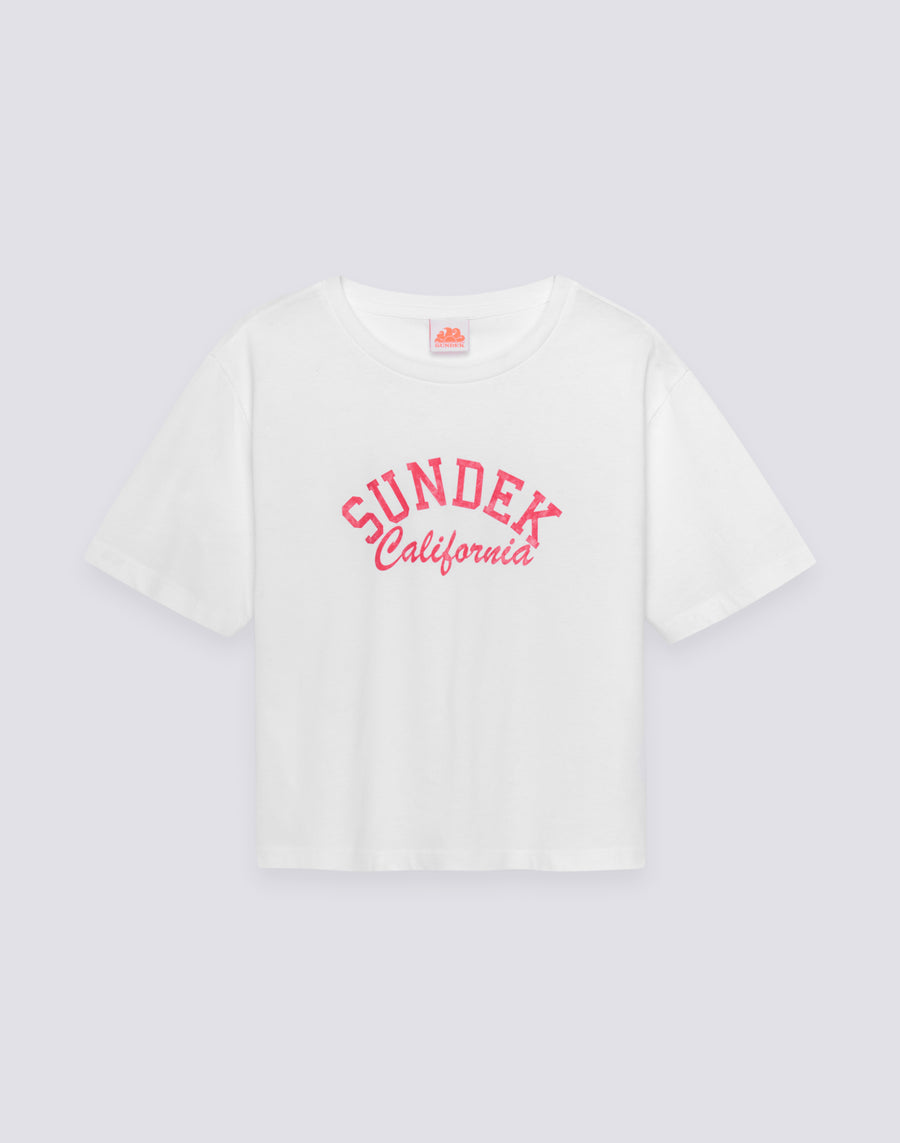 T-shirt femme en coton avec coupe courte et lavage vintage qui lui confère un look intemporel. Le logo SUNDEK CALIFORNIA imprimé sur le devant représente l'identité de la marque et ajoute du caractère au vêtement. Parfait pour celles qui aiment un style décontracté mais soigné, à porter seul avec un short ou superposé avec d'autres pièces de la collection. Un essentiel polyvalent qui capture l'âme de la culture californienne.