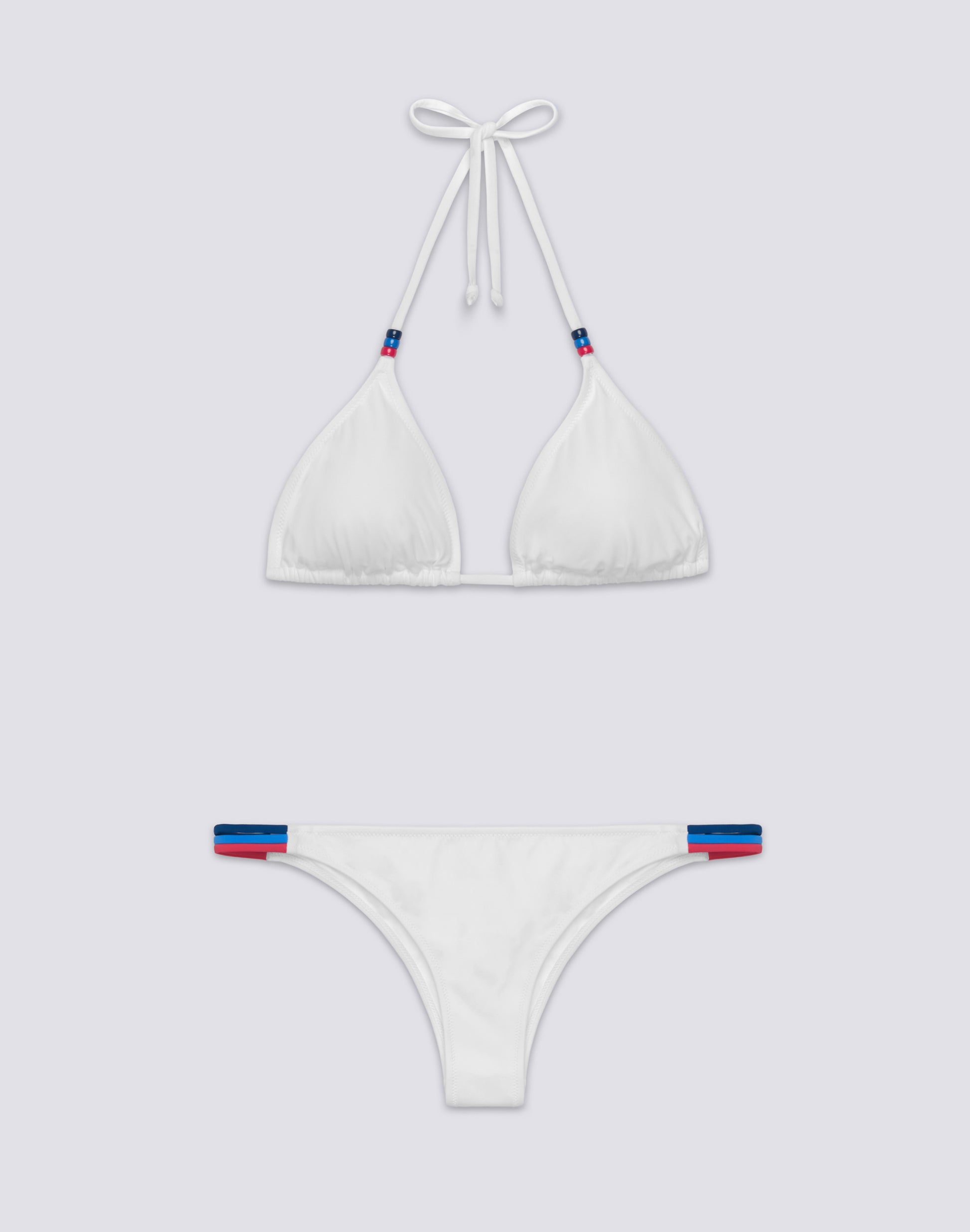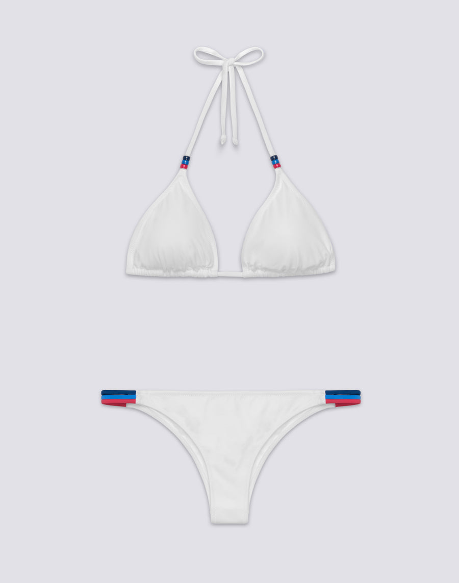Faites de la place dans votre valise pour ce bikini en tissu éco-responsable. Le haut triangle rembourré est orné de perles amovibles sur les liens. Le bas fixe présente un détail latéral tricolore à trois bandes, façon Sundek.