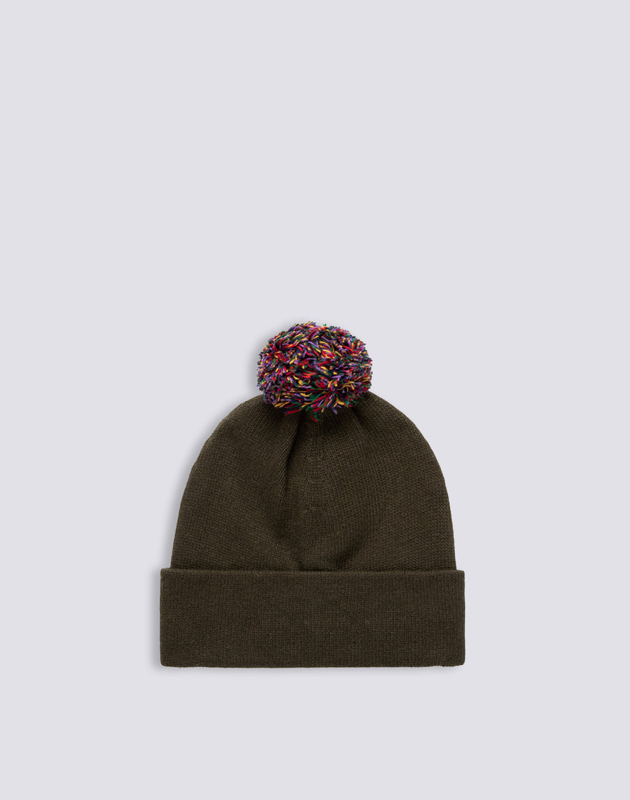 Divertente berretto con pom pom multicolor e logo ricamato, per dare colore agli inverni grigi e aggiungere divertimento alle giornate sulla neve.