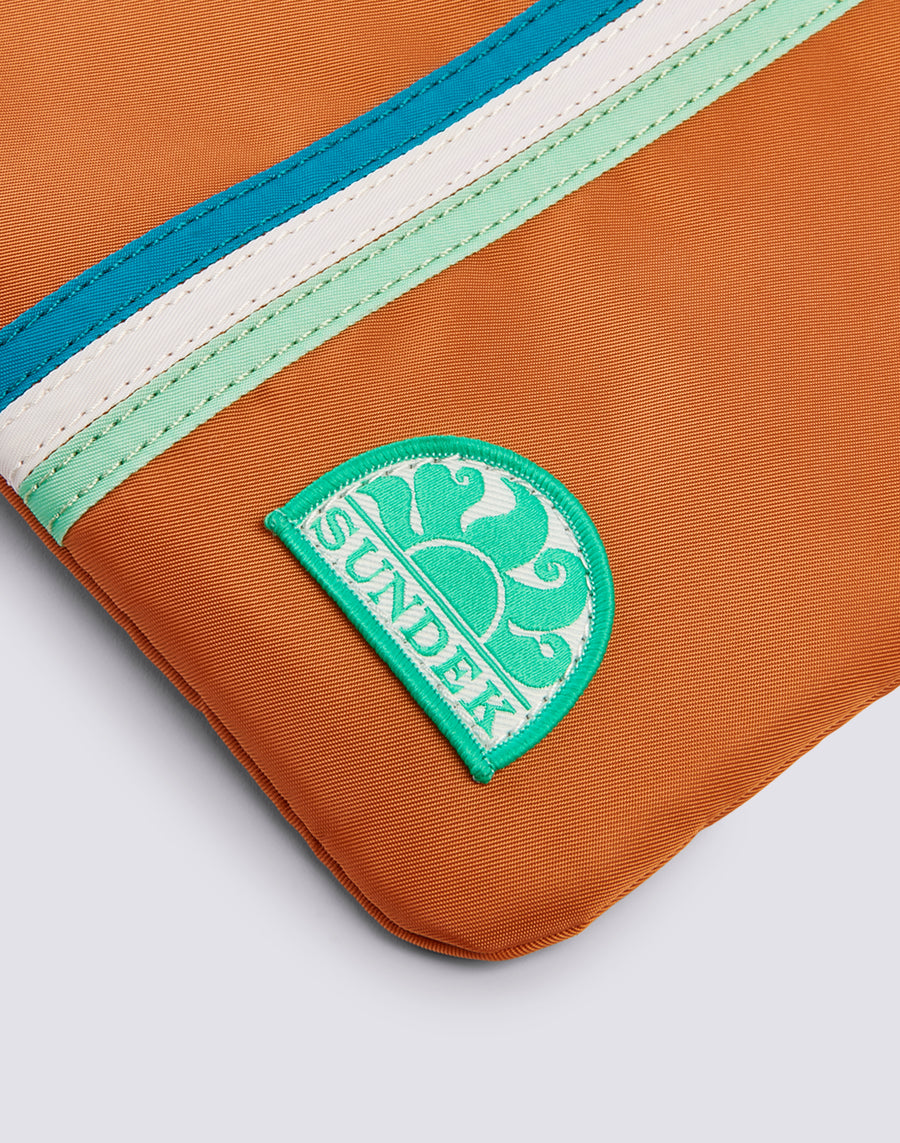 Pochette mare leggera e foderata con il dettaglio iconico dei nastri tricolore per custodire e proteggere l'essenziale che preferisci tenere a portata di mano. Perfetta da portare in borsa o da sola grazie alla pratica asola passamano.