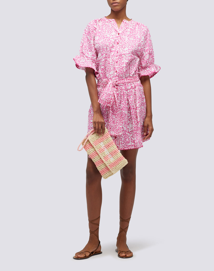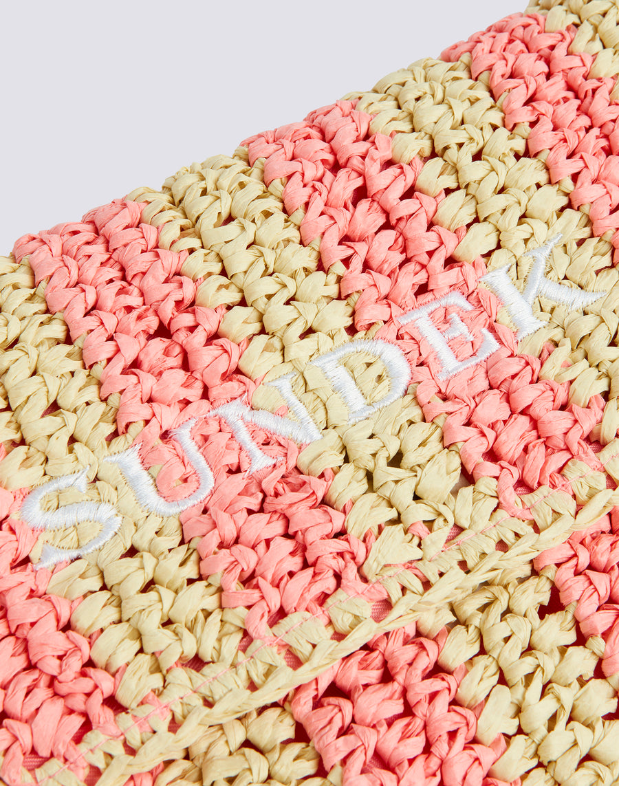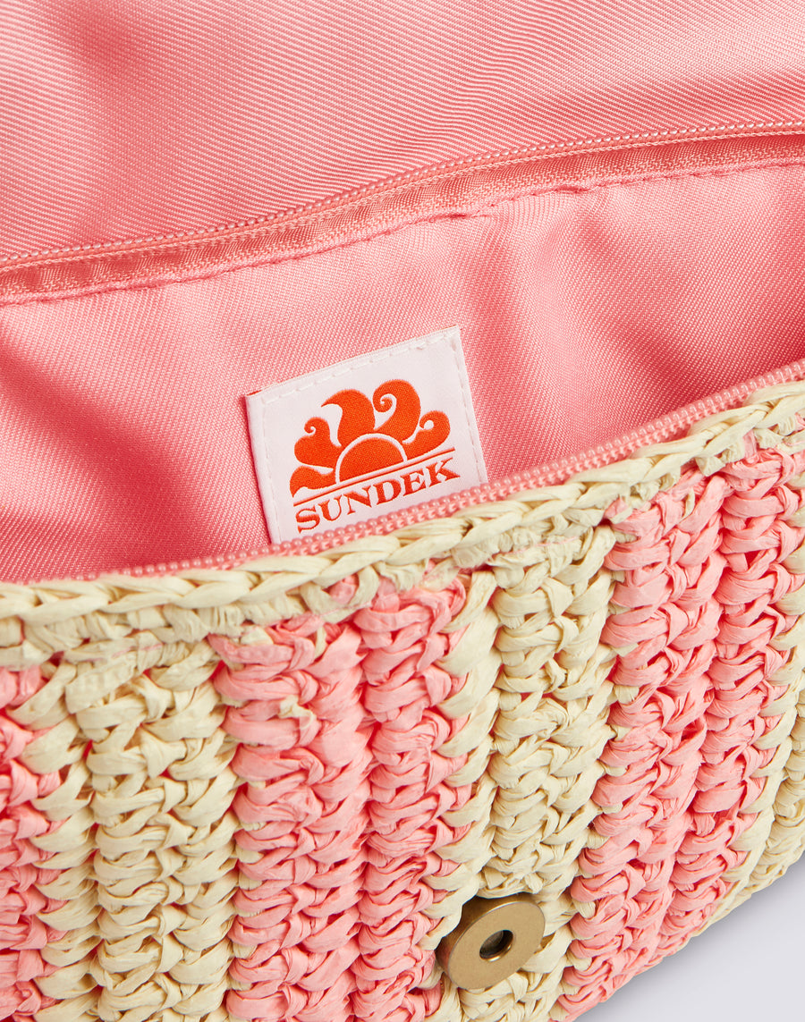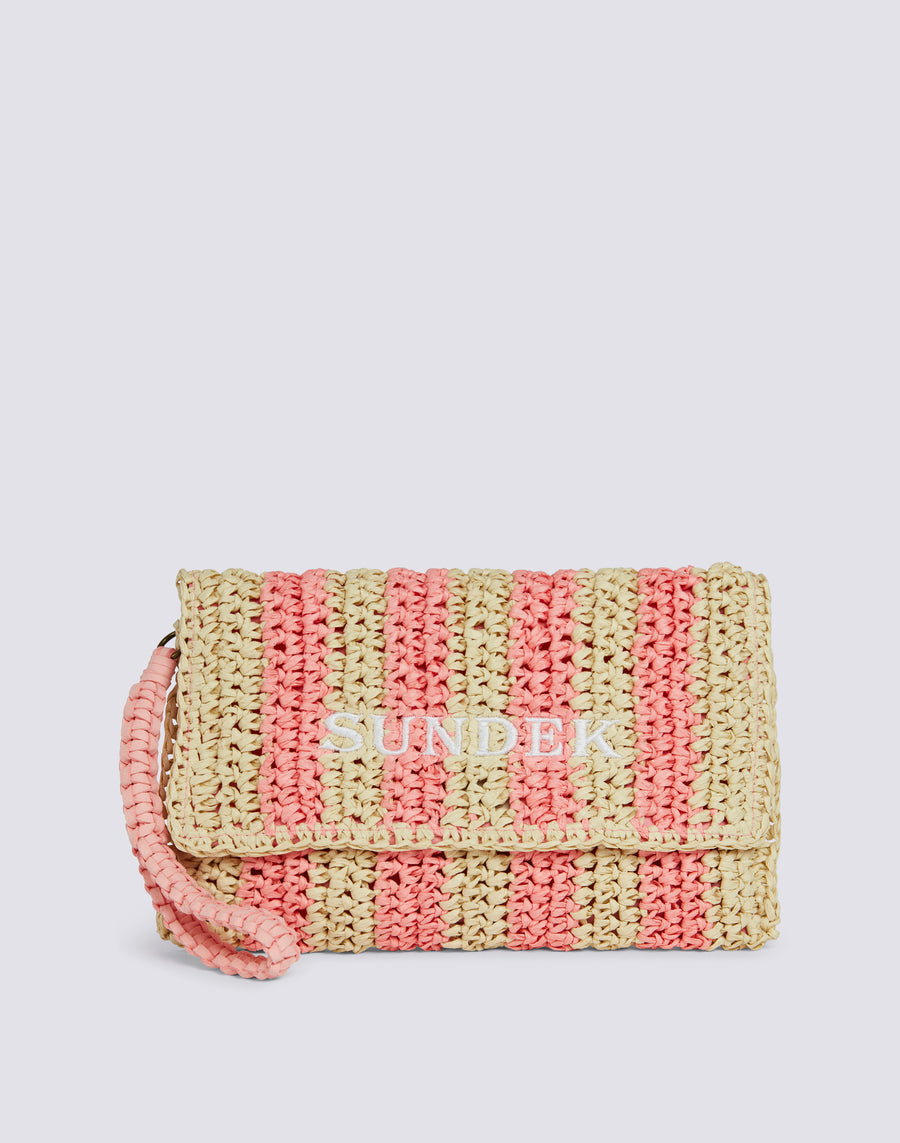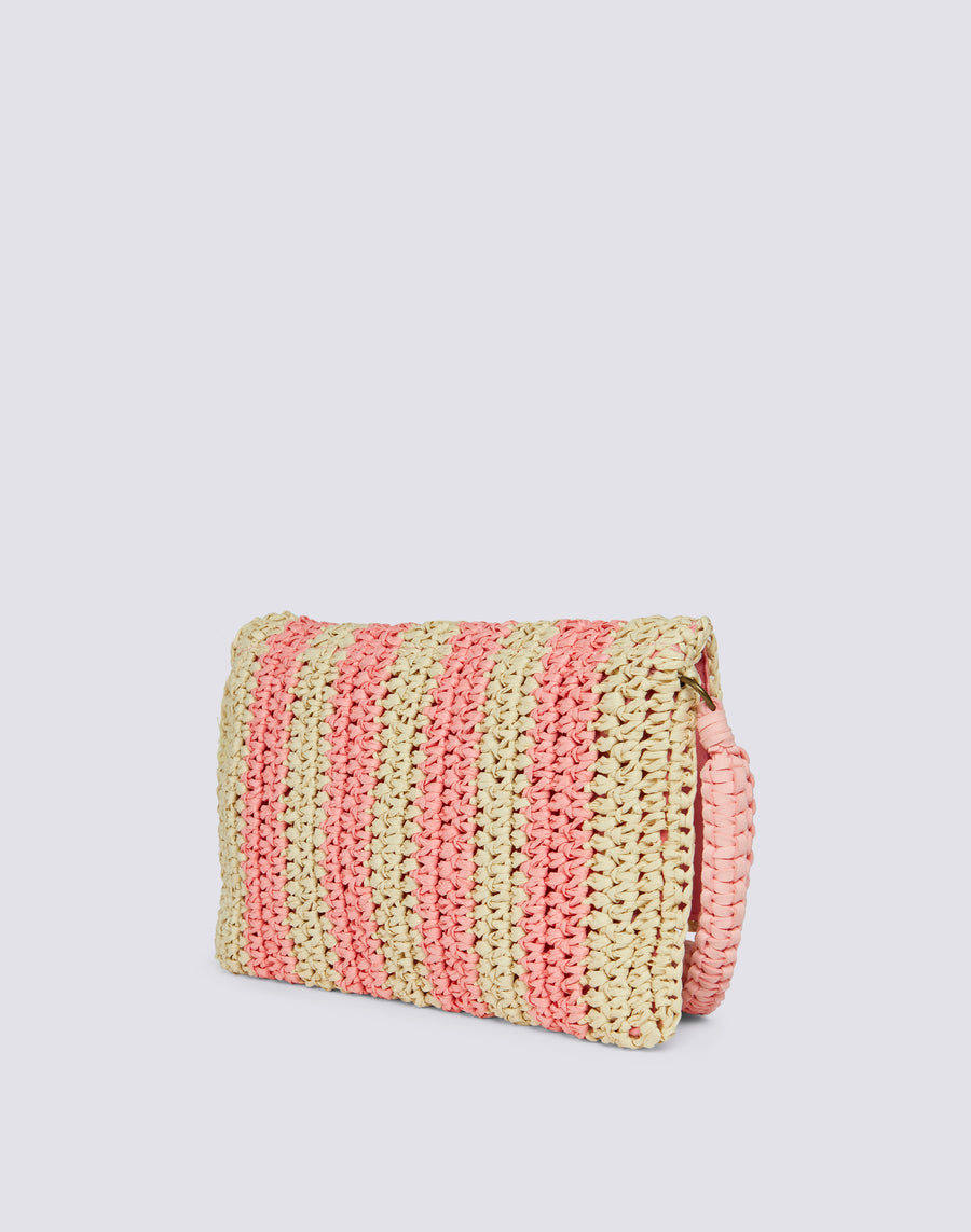 Pochette Izumi in carta effetto paglia con motivo a righe. Dotata di asola passamano, è comoda da portare in giro grazie alle piccole dimensioni. Il motivo rigato la rende vivace e originale.