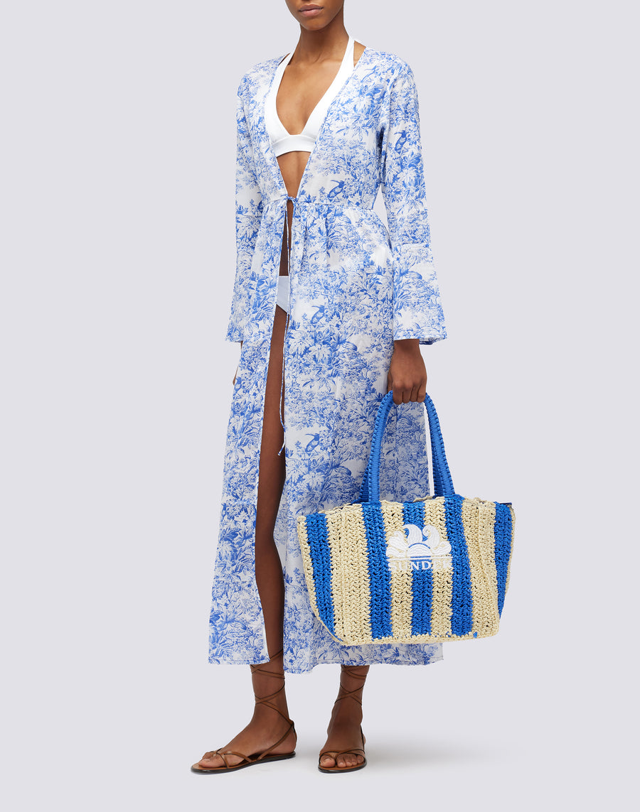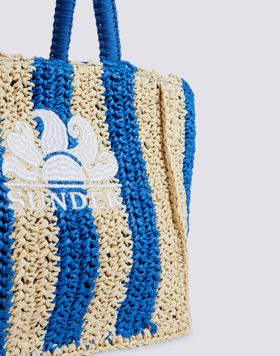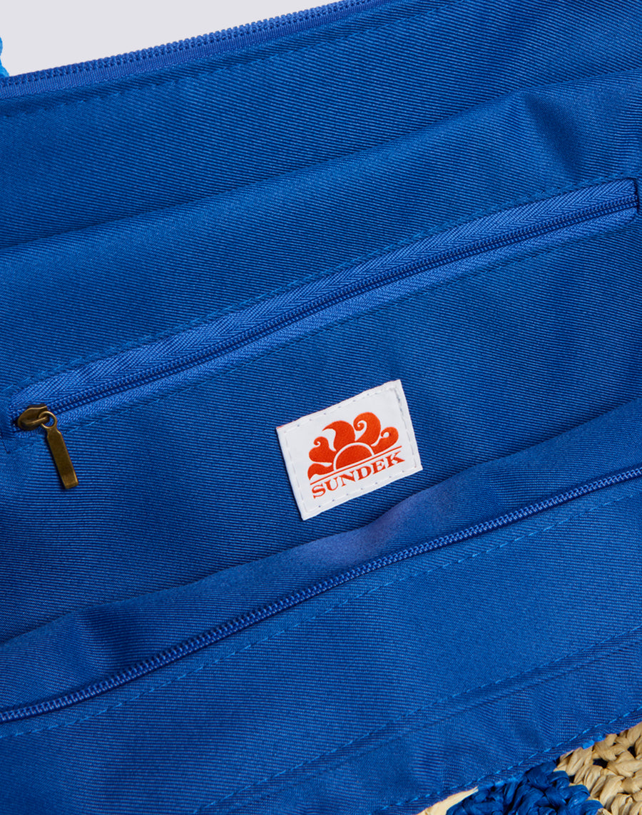 Elegante borsa in paglia intrecciata con logo ricamato e chiusura con zip. Dotata di mini tasca interna, è perfetta per la spiaggia o per una passeggiata in centro, per avere sempre con te tutto il necessario.