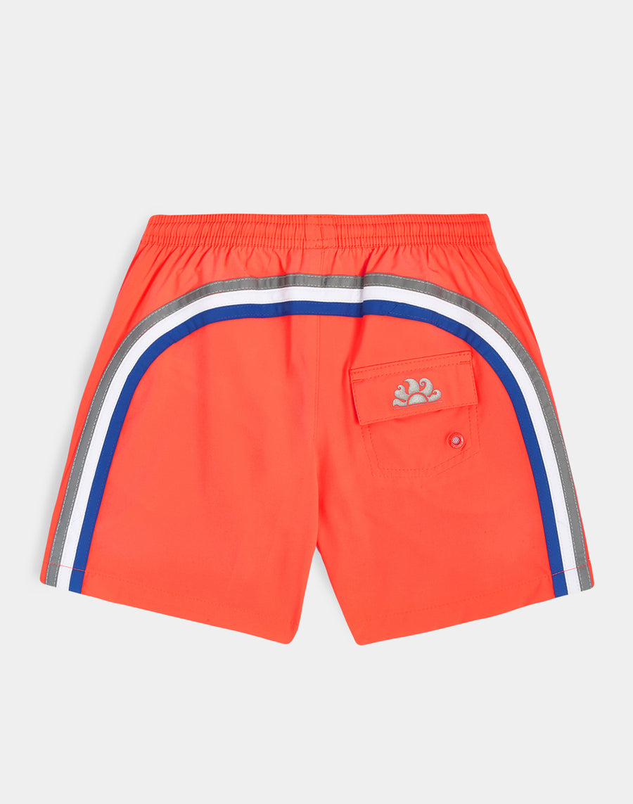 Colore intenso e tessuto iper-confortevole ad asciugatura rapida per questi pantaloncini mare bimbo. Un modello che accompagnerà il tuo bimbo nelle sue mille attività in vacanza, perfetto per muoversi e giocare in piena libertà. Leggero, resistente, si asciuga rapidissimo ed è realizzato in tessuto 4 Way Stretch. Ha le nostre classiche cuciture a tre aghi che aumentano la resistenza nel tempo e il nostro arcobaleno iconico sul retro.