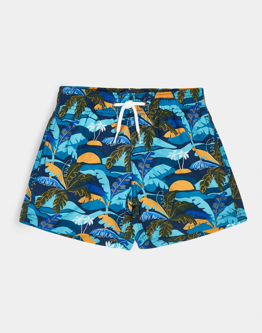 Colori intensi e tessuto iper-confortevole in poliestere riciclato per questi pantaloncini mare bimbo. Un modello che accompagnerà il tuo bimbo nelle sue mille attività in vacanza, perfetto per muoversi e giocare in piena libertà. Realizzato con stampa safari, è da mettere in valigia, anno dopo anno.