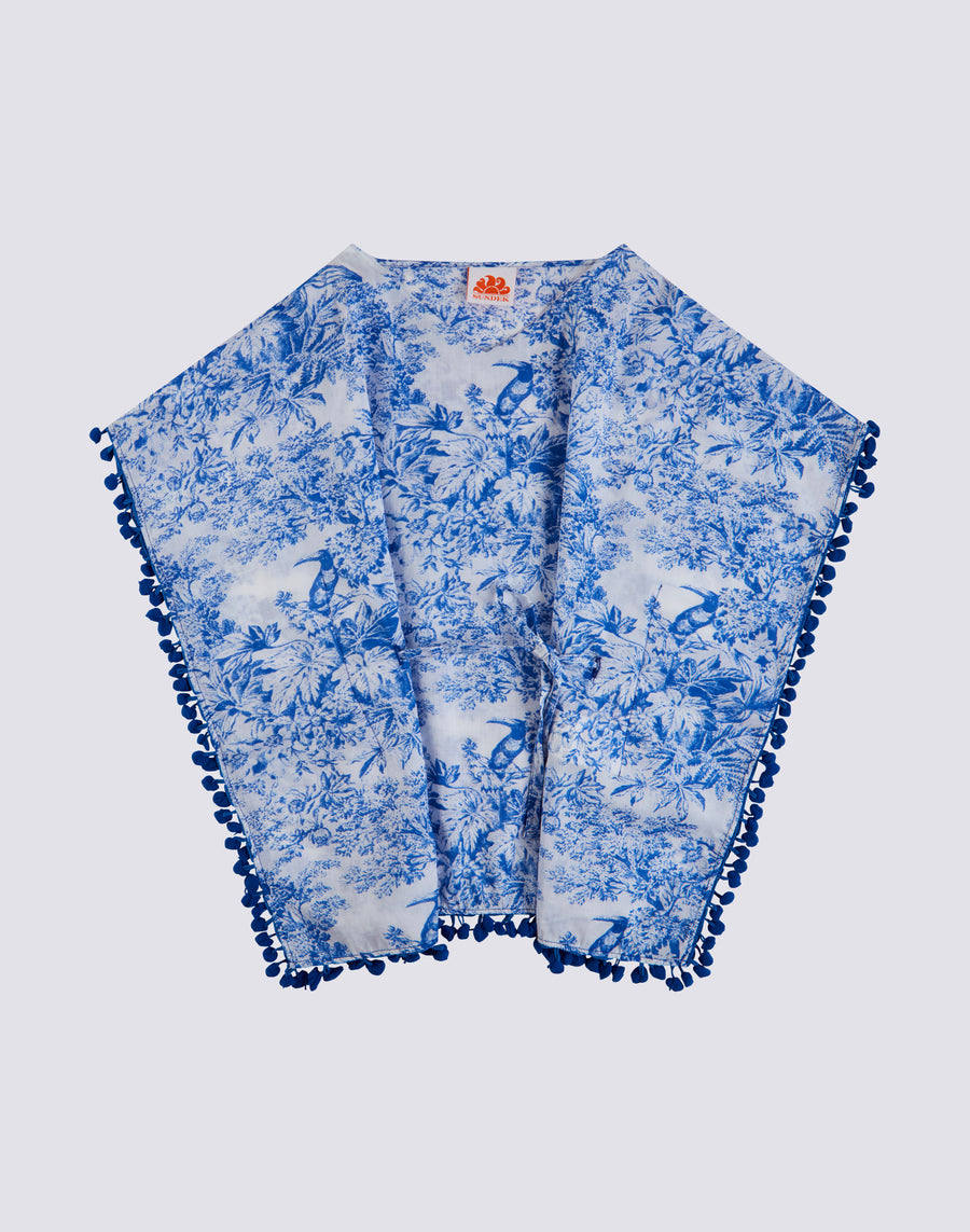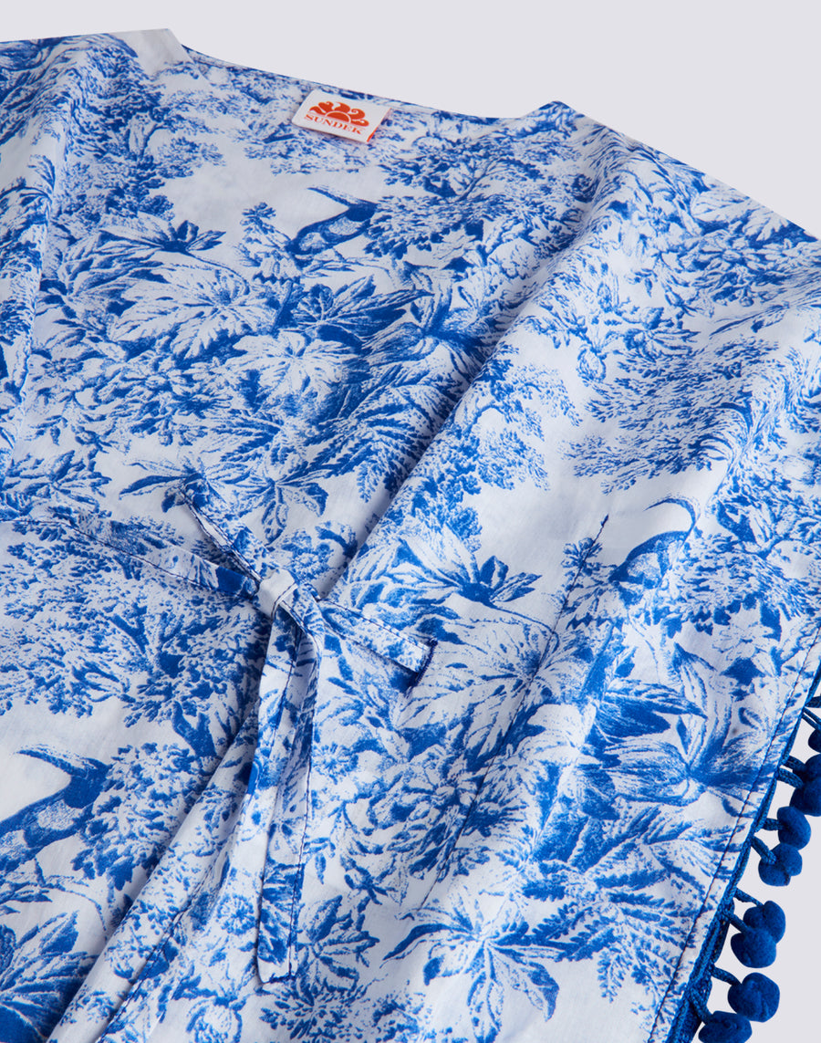 Questo kaftano da bambina è perfetto per un look raffinato ed elegante. Stampato con motivo toile de jouy, la farà sentire romantica e alla moda. Ideale per occasioni speciali o semplicemente per un tocco di classe nei giorni in spiaggia.