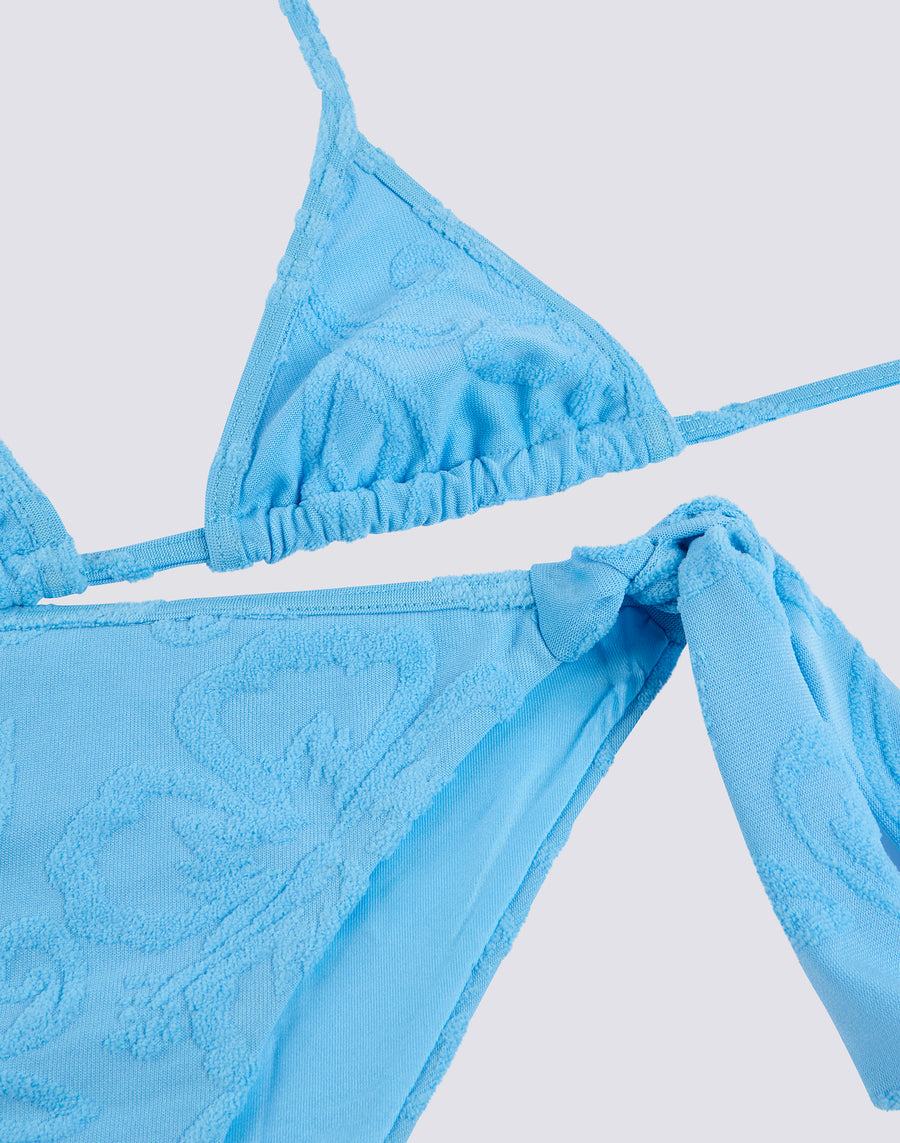 Mini bikini in spugna jacquard con motivo SK23 formato da triangolo con laccetti regolabili e slip con fiocchetti, sempre regolabili.