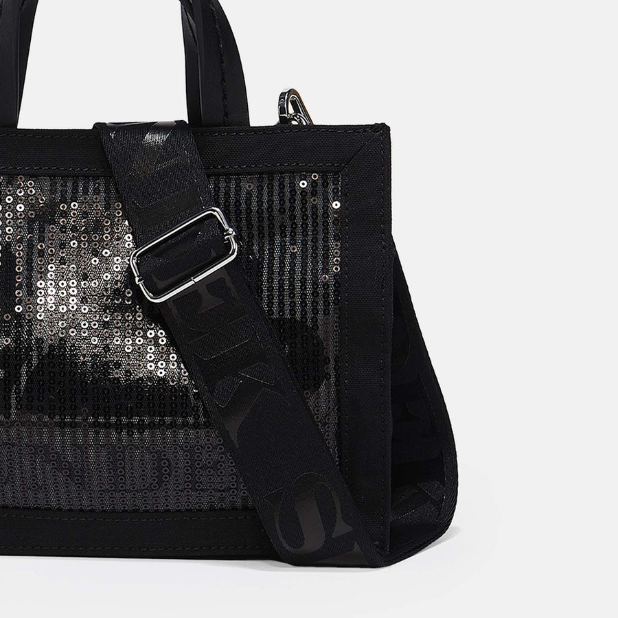 Borsa piccola in mesh con dettagli in paillettes con logo Sundek stampato. Questa borsa è perfetta per la spiaggia grazie alla sua rete a trame sottili che impediscono il passaggio della sabbia.