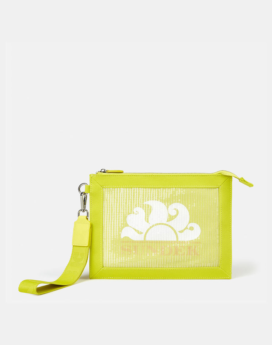 Clutch in mesh con paillettes e logo Sundek ricamato. Perfetta sia come necessaire che da usare come pochette. Laccetto con logo Sundek rimovibile. Misure: 27 x 20.5cm
