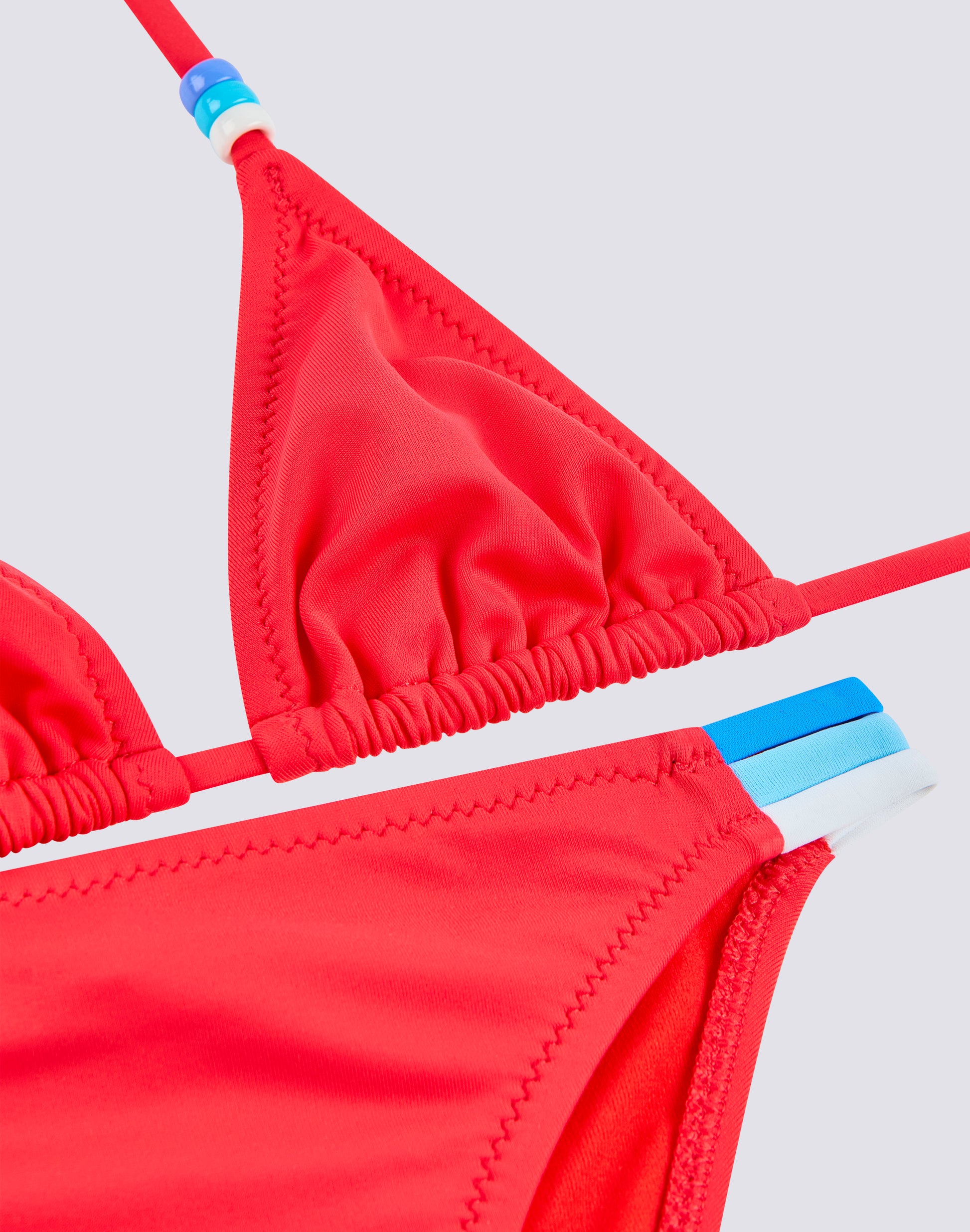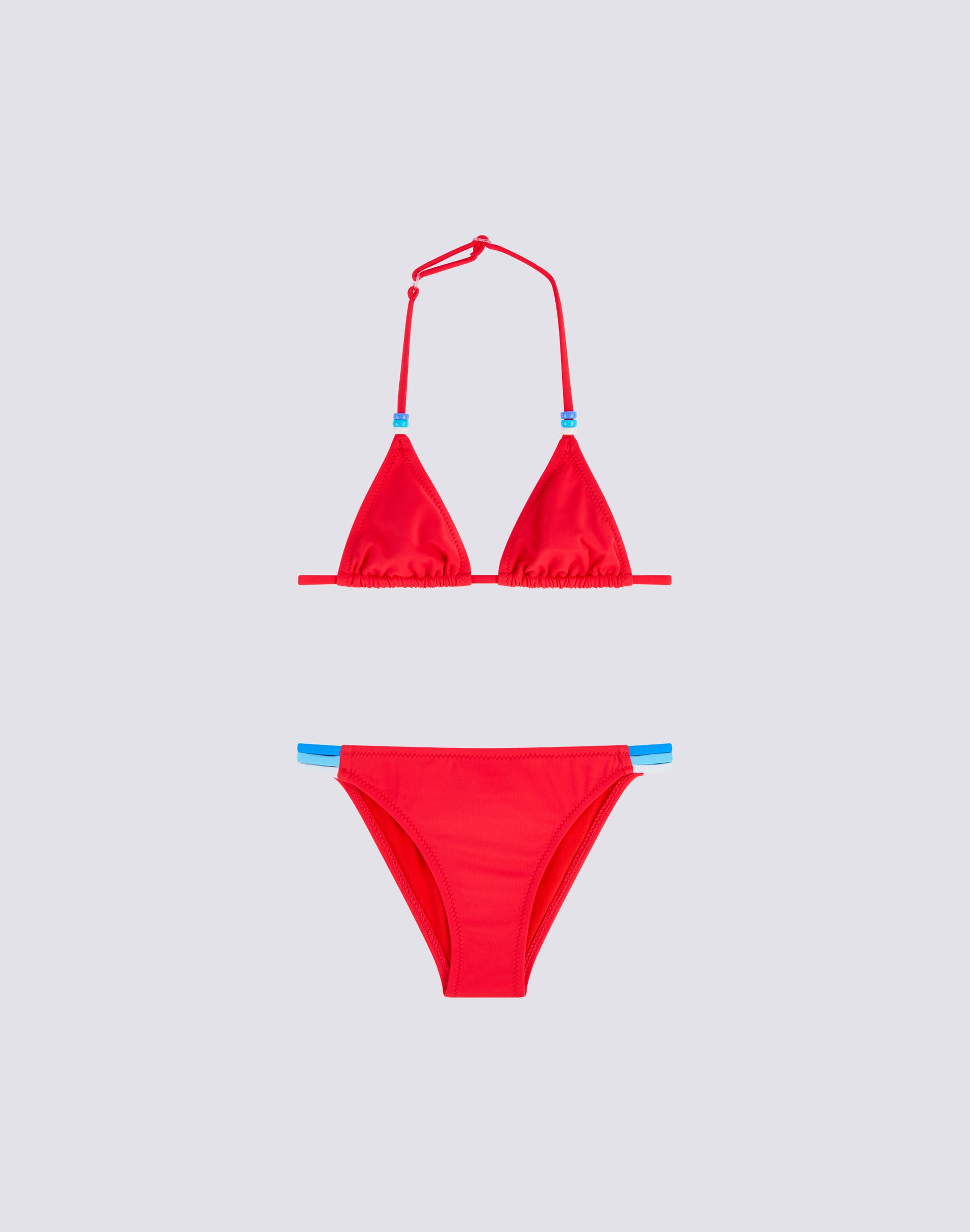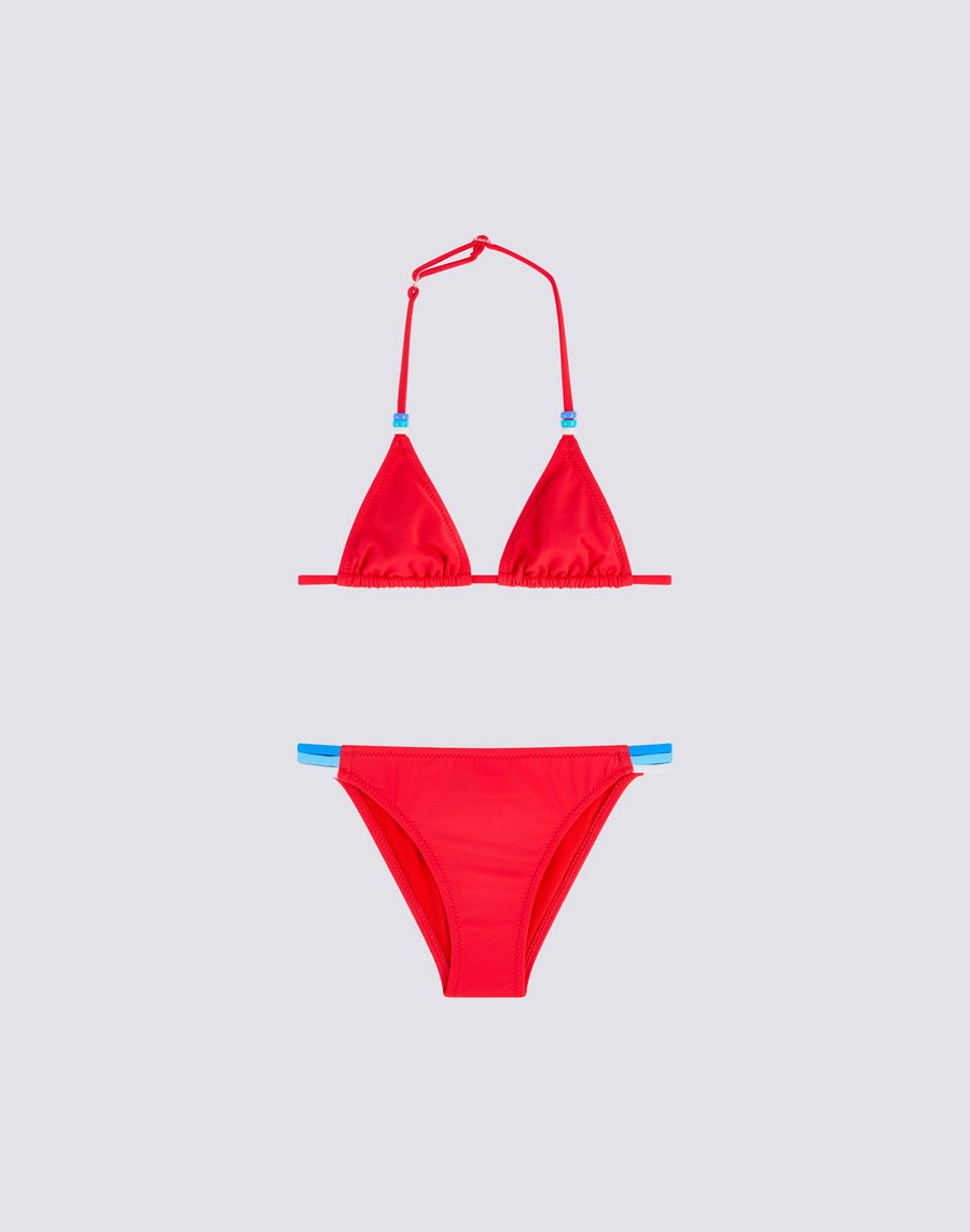 Bikini mare bambina con top a triangolo regolabile con i laccetti dietro al collo impreziositi da perline tricolori. I tre colori delle perline sono riproposti sul dettaglio tricolore laterale dello slip. I due pezzi del costume sono realizzati in tessuto VITA by Carvico confortevole, resistente e che non teme cloro e creme solari.
