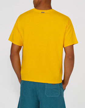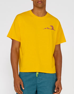 Un ricamo a forma di onde per portare l'estate con te ovunque, in viaggio o nel tuo quotidiano. La t-shirt da uomo realizzata in morbido cotone jersey presenta una vestibilità boxy, corta, ma larga e abbondante, perfetta per innumerevoli abbinamenti.