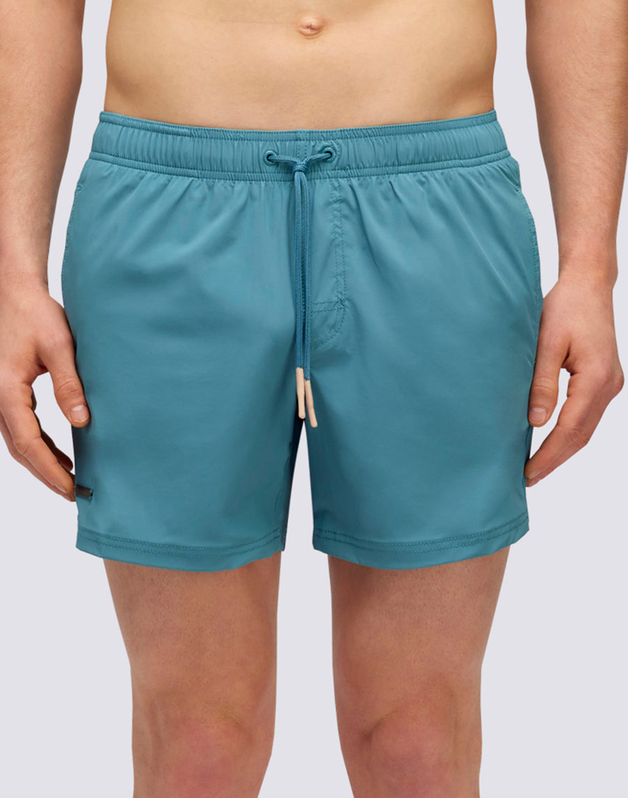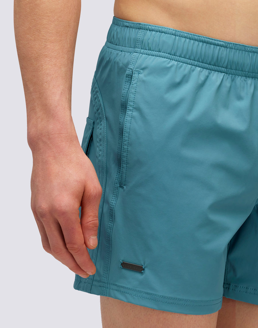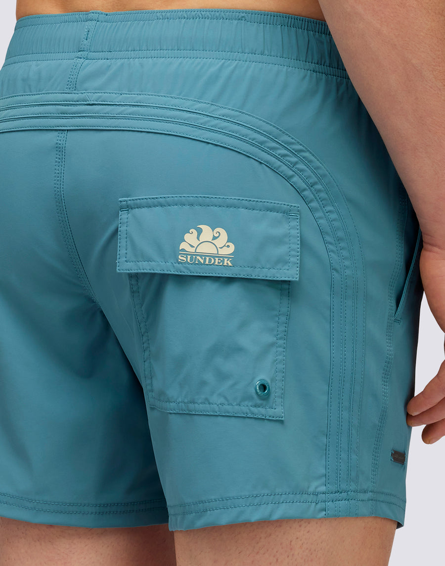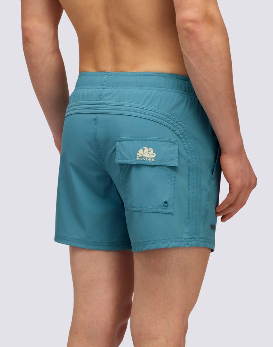 Costume da bagno da uomo GoldenWave Sundek, con delicato arcobaleno posteriore tono su tono, coulisse e vita elasticizzata. Tasca posteriore con logo ricamato. Il modello è alto 188cm e veste una taglia M.