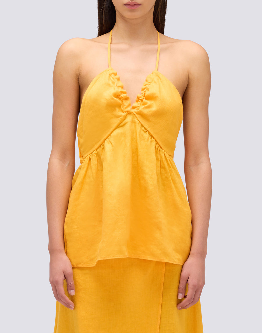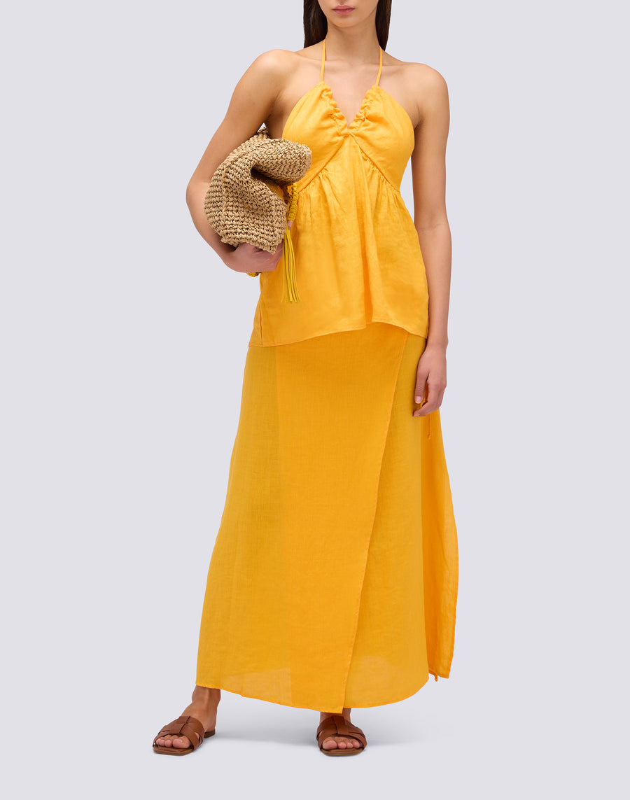 Top smanicato in lino tinto capo con scollatura a V e allacciatura dietro il collo. Ideale se cerchi un capo comodo, fresco, essenziale, ma versatile per i tuoi prossimi look.